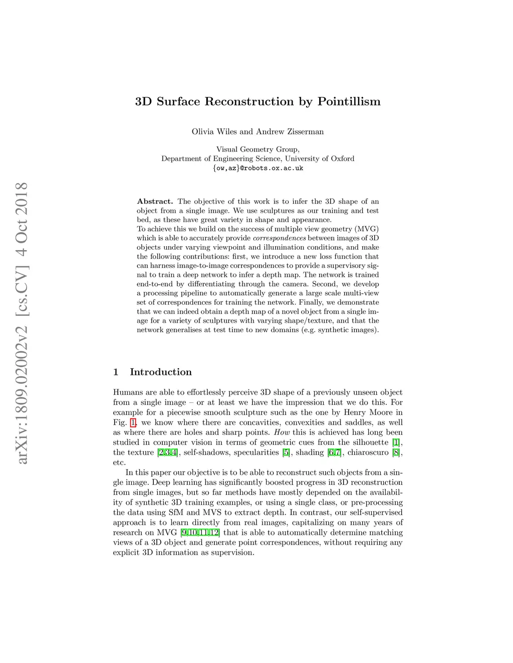The objective of this work is to infer the 3D shape of an object from a single image. We use sculptures as our training and test bed, as these have great variety in shape and appearance. To achieve this we build on the success of multiple view geometry (MVG) which is able to accurately provide correspondences between images of 3D objects under varying viewpoint and illumination conditions, and make the following contributions: first, we introduce a new loss function that can harness image-to-image correspondences to provide a supervisory signal to train a deep network to infer a depth map. The network is trained end-to-end by differentiating through the camera. Second, we develop a processing pipeline to automatically generate a large scale multi-view set of correspondences for training the network. Finally, we demonstrate that we can indeed obtain a depth map of a novel object from a single image for a variety of sculptures with varying shape/texture, and that the network generalises at test time to new domains (e.g. synthetic images).