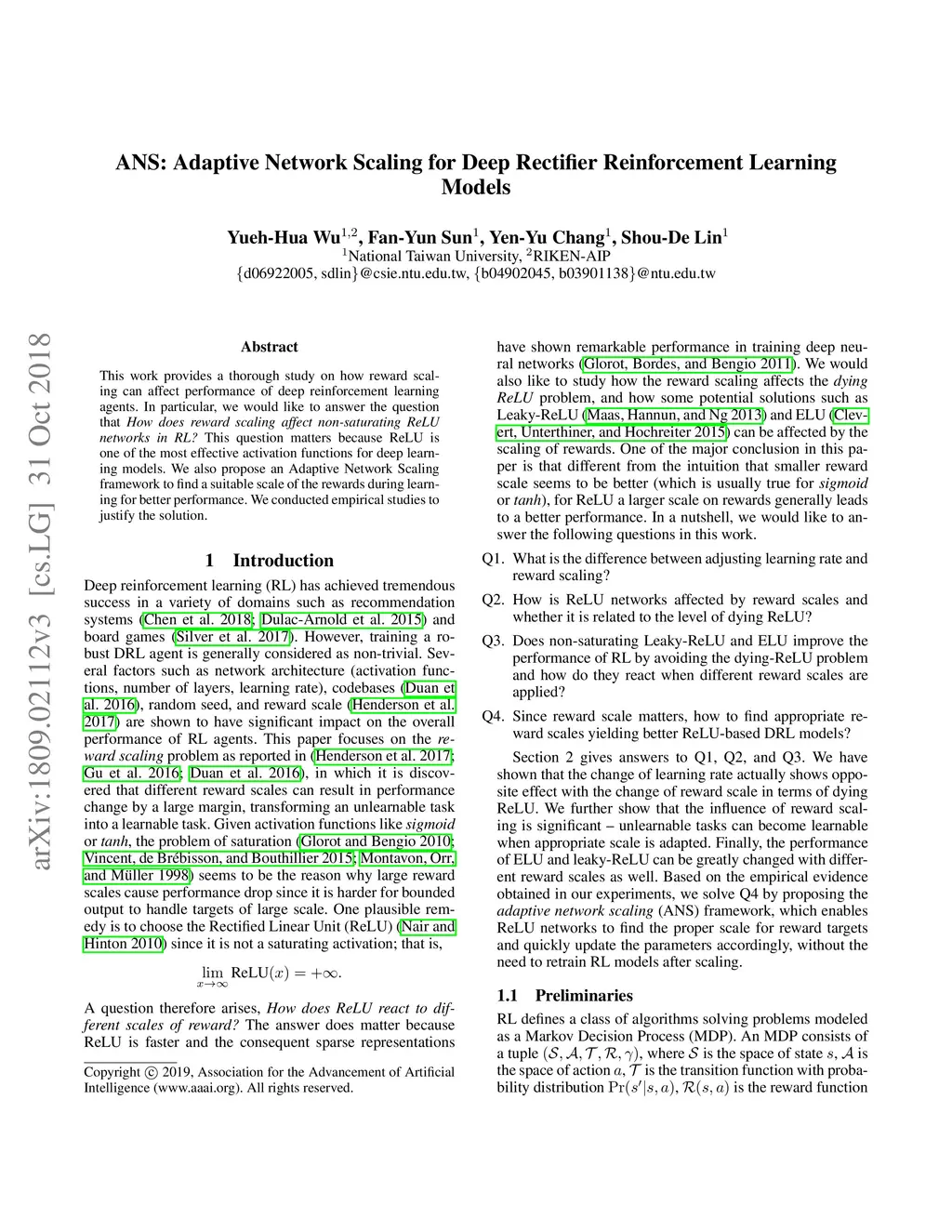 ANS: Adaptive Network Scaling for Deep Rectifier Reinforcement Learning