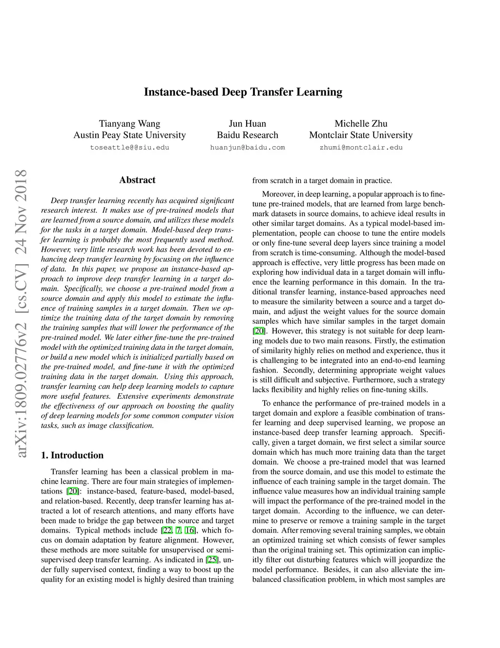 Deep transfer learning recently has acquired significant research interest. It makes use of pre-trained models that are learned from a source domain, and utilizes these models for the tasks in a target domain. Model-based deep transfer learning is probably the most frequently used method. However, very little research work has been devoted to enhancing deep transfer learning by focusing on the influence of data. In this paper, we propose an instance-based approach to improve deep transfer learning in a target domain. Specifically, we choose a pre-trained model from a source domain and apply this model to estimate the influence of training samples in a target domain. Then we optimize the training data of the target domain by removing the training samples that will lower the performance of the pre-trained model. We later either fine-tune the pre-trained model with the optimized training data in the target domain, or build a new model which is initialized partially based on the pre-trained model, and fine-tune it with the optimized training data in the target domain. Using this approach, transfer learning can help deep learning models to capture more useful features. Extensive experiments demonstrate the effectiveness of our approach on boosting the quality of deep learning models for some common computer vision tasks, such as image classification.