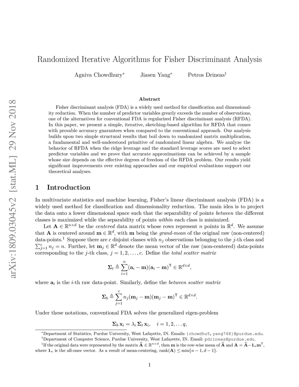 Fisher discriminant analysis (FDA) is a widely used method for classification and dimensionality reduction. When the number of predictor variables greatly exceeds the number of observations, one of the alternatives for conventional FDA is regularized Fisher discriminant analysis (RFDA). In this paper, we present a simple, iterative, sketching-based algorithm for RFDA that comes with provable accuracy guarantees when compared to the conventional approach. Our analysis builds upon two simple structural results that boil down to randomized matrix multiplication, a fundamental and well-understood primitive of randomized linear algebra. We analyze the behavior of RFDA when the ridge leverage and the standard leverage scores are used to select predictor variables and we prove that accurate approximations can be achieved by a sample whose size depends on the effective degrees of freedom of the RFDA problem. Our results yield significant improvements over existing approaches and our empirical evaluations support our theoretical analyses.