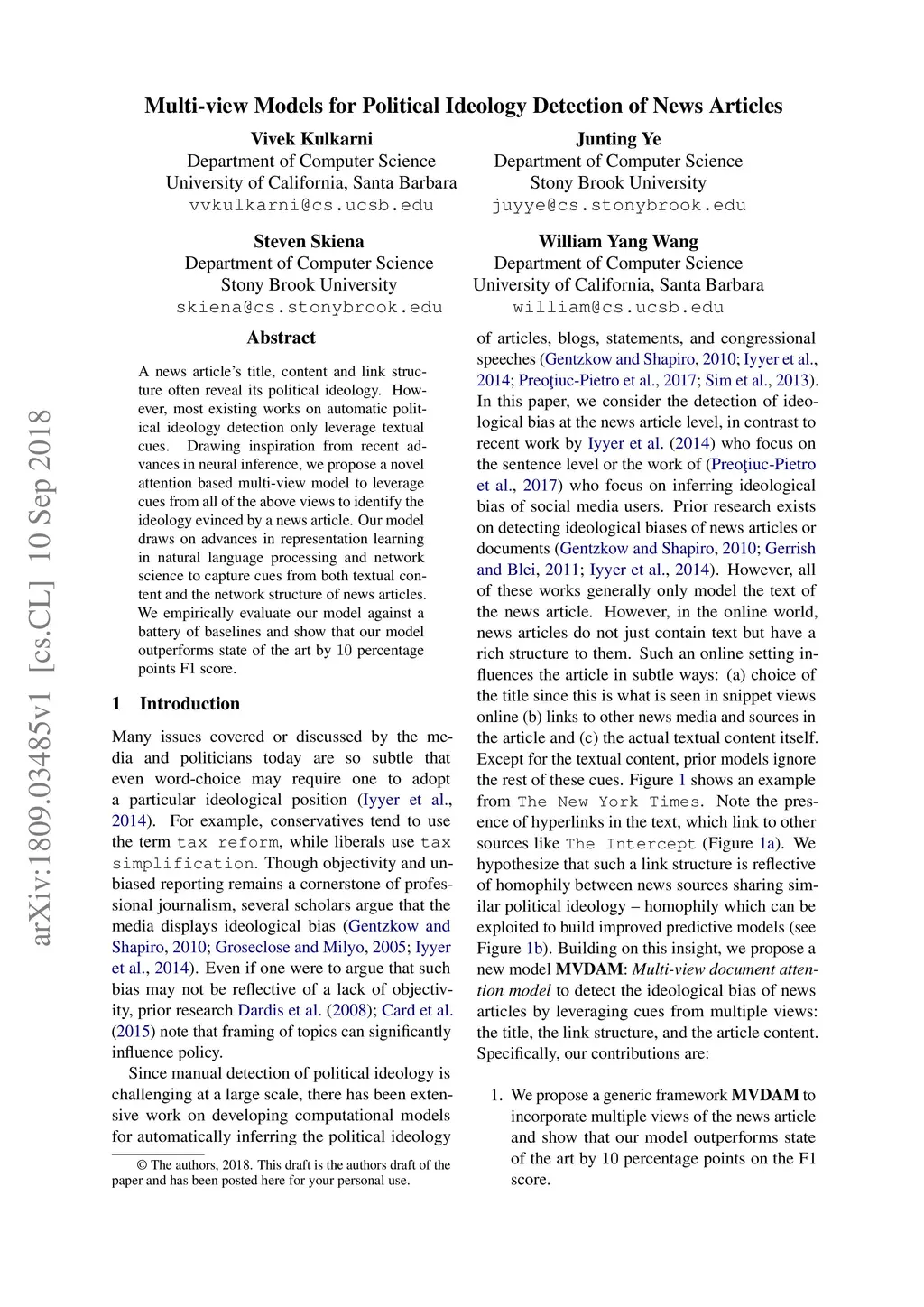 A news article's title, content and link structure often reveal its political ideology. However, most existing works on automatic political ideology detection only leverage textual cues. Drawing inspiration from recent advances in neural inference, we propose a novel attention based multi-view model to leverage cues from all of the above views to identify the ideology evinced by a news article. Our model draws on advances in representation learning in natural language processing and network science to capture cues from both textual content and the network structure of news articles. We empirically evaluate our model against a battery of baselines and show that our model outperforms state of the art by 10 percentage points F1 score.