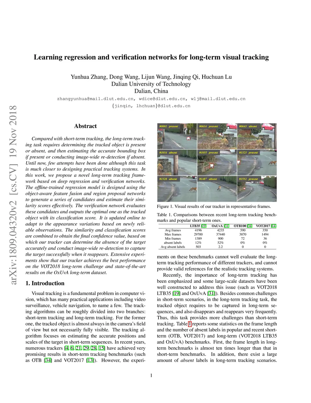 Compared with short-term tracking, the long-term tracking task requires determining the tracked object is present or absent, and then estimating the accurate bounding box if present or conducting image-wide re-detection if absent. Until now, few attempts have been done although this task is much closer to designing practical tracking systems. In this work, we propose a novel long-term tracking framework based on deep regression and verification networks. The offline-trained regression model is designed using the object-aware feature fusion and region proposal networks to generate a series of candidates and estimate their similarity scores effectively. The verification network evaluates these candidates to output the optimal one as the tracked object with its classification score, which is online updated to adapt to the appearance variations based on newly reliable observations. The similarity and classification scores are combined to obtain a final confidence value, based on which our tracker can determine the absence of the target accurately and conduct image-wide re-detection to capture the target successfully when it reappears. Extensive experiments show that our tracker achieves the best performance on the VOT2018 long-term challenge and state-of-the-art results on the OxUvA long-term dataset.