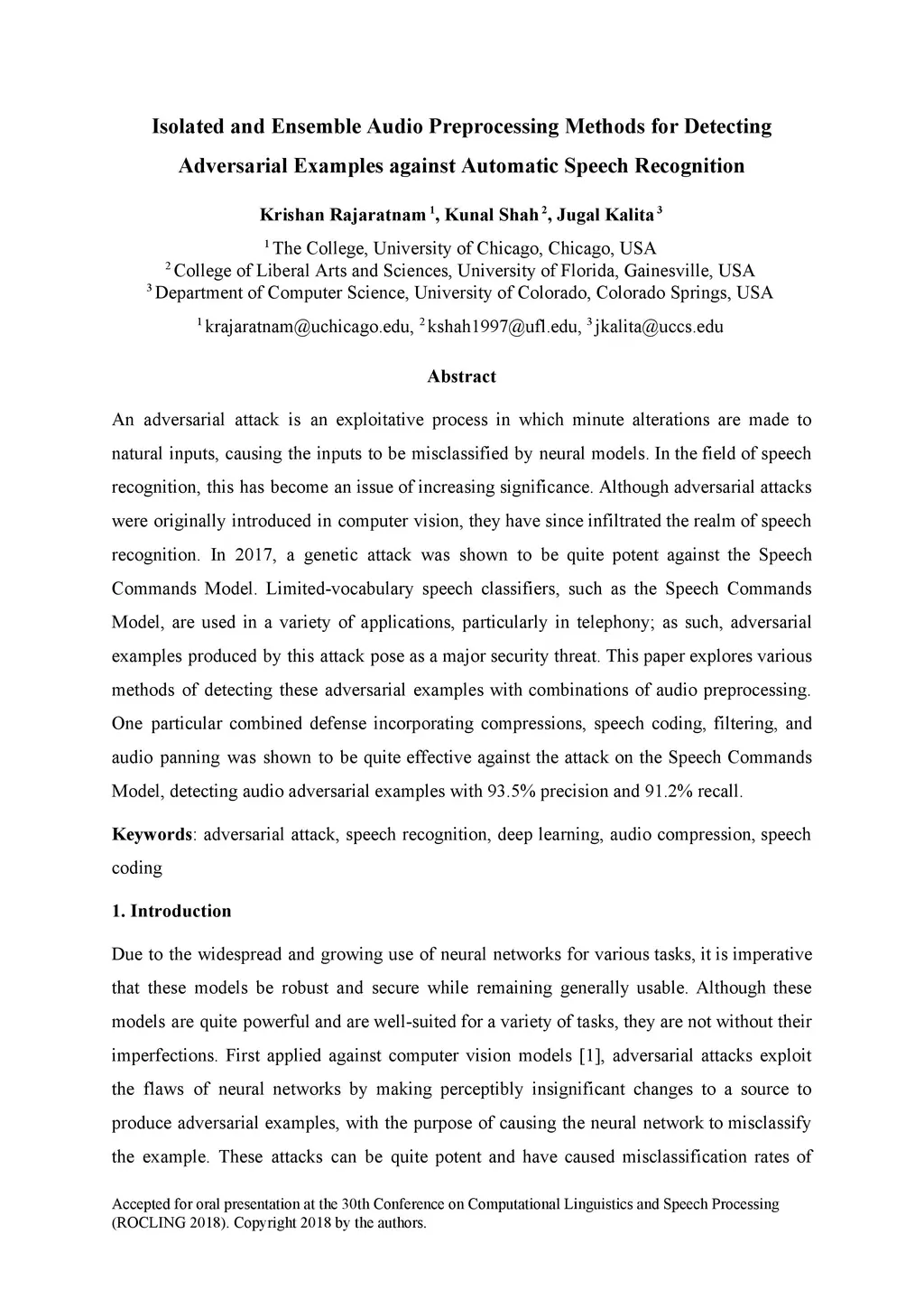 An adversarial attack is an exploitative process in which minute alterations are made to natural inputs, causing the inputs to be misclassified by neural models. In the field of speech recognition, this has become an issue of increasing significance. Although adversarial attacks were originally introduced in computer vision, they have since infiltrated the realm of speech recognition. In 2017, a genetic attack was shown to be quite potent against the Speech Commands Model. Limited-vocabulary speech classifiers, such as the Speech Commands Model, are used in a variety of applications, particularly in telephony; as such, adversarial examples produced by this attack pose as a major security threat. This paper explores various methods of detecting these adversarial examples with combinations of audio preprocessing. One particular combined defense incorporating compressions, speech coding, filtering, and audio panning was shown to be quite effective against the attack on the Speech Commands Model, detecting audio adversarial examples with 93.5% precision and 91.2% recall.