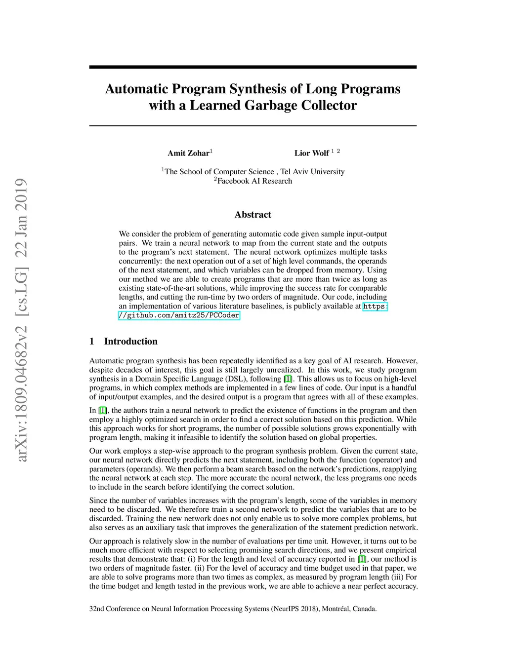 We consider the problem of generating automatic code given sample input-output pairs. We train a neural network to map from the current state and the outputs to the program's next statement. The neural network optimizes multiple tasks concurrently: the next operation out of a set of high level commands, the operands of the next statement, and which variables can be dropped from memory. Using our method we are able to create programs that are more than twice as long as existing state-of-the-art solutions, while improving the success rate for comparable lengths, and cutting the run-time by two orders of magnitude. Our code, including an implementation of various literature baselines, is publicly available at https://github.com/amitz25/PCCoder