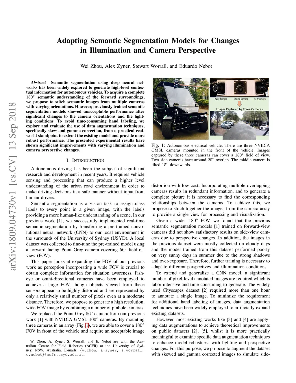 Semantic segmentation using deep neural networks has been widely explored to generate high-level contextual information for autonomous vehicles. To acquire a complete semantic understanding of the forward surroundings, we propose to stitch semantic images from multiple cameras with varying orientations. However, previously trained semantic segmentation models showed unacceptable performance after significant changes to the camera orientations and the lighting conditions. To avoid time-consuming hand labeling, we explore and evaluate the use of data augmentation techniques, specifically skew and gamma correction, from a practical real-world standpoint to extend the existing model and provide more robust performance. The presented experimental results have shown significant improvements with varying illumination and camera perspective changes.