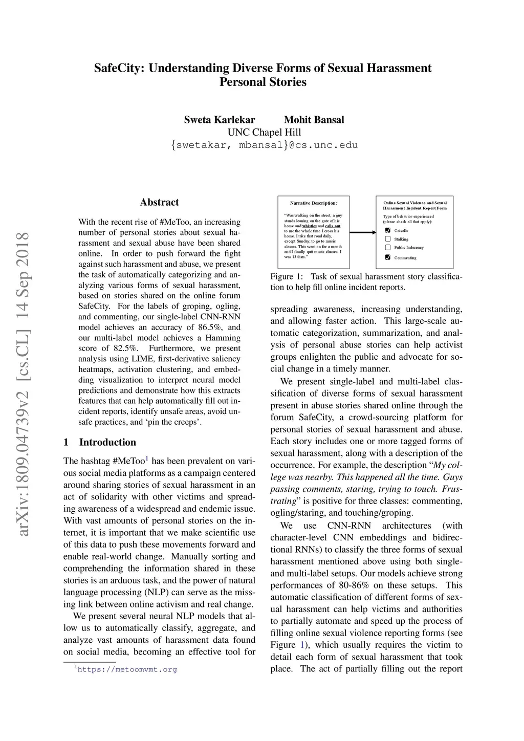 With the recent rise of #MeToo, an increasing number of personal stories about sexual harassment and sexual abuse have been shared online. In order to push forward the fight against such harassment and abuse, we present the task of automatically categorizing and analyzing various forms of sexual harassment, based on stories shared on the online forum SafeCity. For the labels of groping, ogling, and commenting, our single-label CNN-RNN model achieves an accuracy of 86.5%, and our multi-label model achieves a Hamming score of 82.5%. Furthermore, we present analysis using LIME, first-derivative saliency heatmaps, activation clustering, and embedding visualization to interpret neural model predictions and demonstrate how this extracts features that can help automatically fill out incident reports, identify unsafe areas, avoid unsafe practices, and 'pin the creeps'.