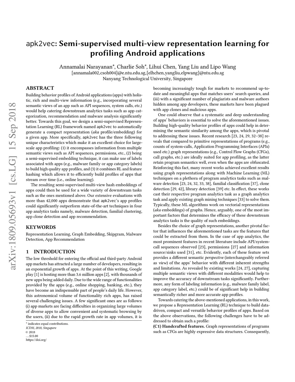 Building behavior profiles of Android applications (apps) with holistic, rich and multi-view information (e.g., incorporating several semantic views of an app such as API sequences, system calls, etc.) would help catering downstream analytics tasks such as app categorization, recommendation and malware analysis significantly better. Towards this goal, we design a semi-supervised Representation Learning (RL) framework named apk2vec to automatically generate a compact representation (aka profile/embedding) for a given app. More specifically, apk2vec has the three following unique characteristics which make it an excellent choice for largescale app profiling: (1) it encompasses information from multiple semantic views such as API sequences, permissions, etc., (2) being a semi-supervised embedding technique, it can make use of labels associated with apps (e.g., malware family or app category labels) to build high quality app profiles, and (3) it combines RL and feature hashing which allows it to efficiently build profiles of apps that stream over time (i.e., online learning). The resulting semi-supervised multi-view hash embeddings of apps could then be used for a wide variety of downstream tasks such as the ones mentioned above. Our extensive evaluations with more than 42,000 apps demonstrate that apk2vec's app profiles could significantly outperform state-of-the-art techniques in four app analytics tasks namely, malware detection, familial clustering, app clone detection and app recommendation.