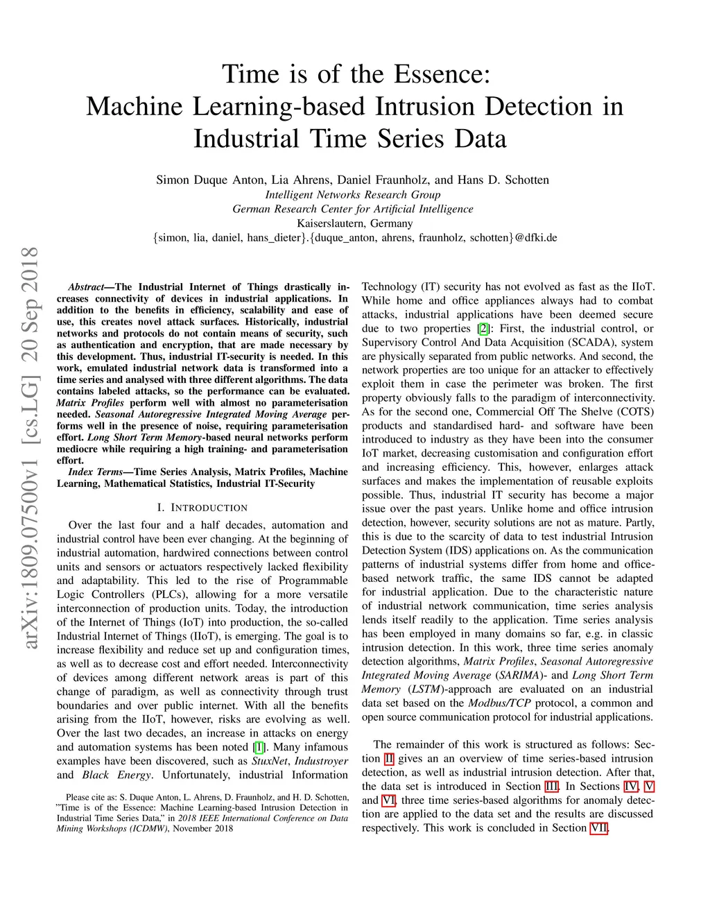 The Industrial Internet of Things drastically increases connectivity of devices in industrial applications. In addition to the benefits in efficiency, scalability and ease of use, this creates novel attack surfaces. Historically, industrial networks and protocols do not contain means of security, such as authentication and encryption, that are made necessary by this development. Thus, industrial IT-security is needed. In this work, emulated industrial network data is transformed into a time series and analysed with three different algorithms. The data contains labeled attacks, so the performance can be evaluated. Matrix Profiles perform well with almost no parameterisation needed. Seasonal Autoregressive Integrated Moving Average performs well in the presence of noise, requiring parameterisation effort. Long Short Term Memory-based neural networks perform mediocre while requiring a high training- and parameterisation effort.