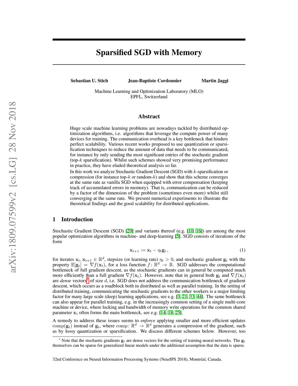 Huge scale machine learning problems are nowadays tackled by distributed optimization algorithms, i.e. algorithms that leverage the compute power of many devices for training. The communication overhead is a key bottleneck that hinders perfect scalability. Various recent works proposed to use quantization or sparsification techniques to reduce the amount of data that needs to be communicated, for instance by only sending the most significant entries of the stochastic gradient (top-k sparsification). Whilst such schemes showed very promising performance in practice, they have eluded theoretical analysis so far. In this work we analyze Stochastic Gradient Descent (SGD) with k-sparsification or compression (for instance top-k or random-k) and show that this scheme converges at the same rate as vanilla SGD when equipped with error compensation (keeping track of accumulated errors in memory). That is, communication can be reduced by a factor of the dimension of the problem (sometimes even more) whilst still converging at the same rate. We present numerical experiments to illustrate the theoretical findings and the better scalability for distributed applications.
