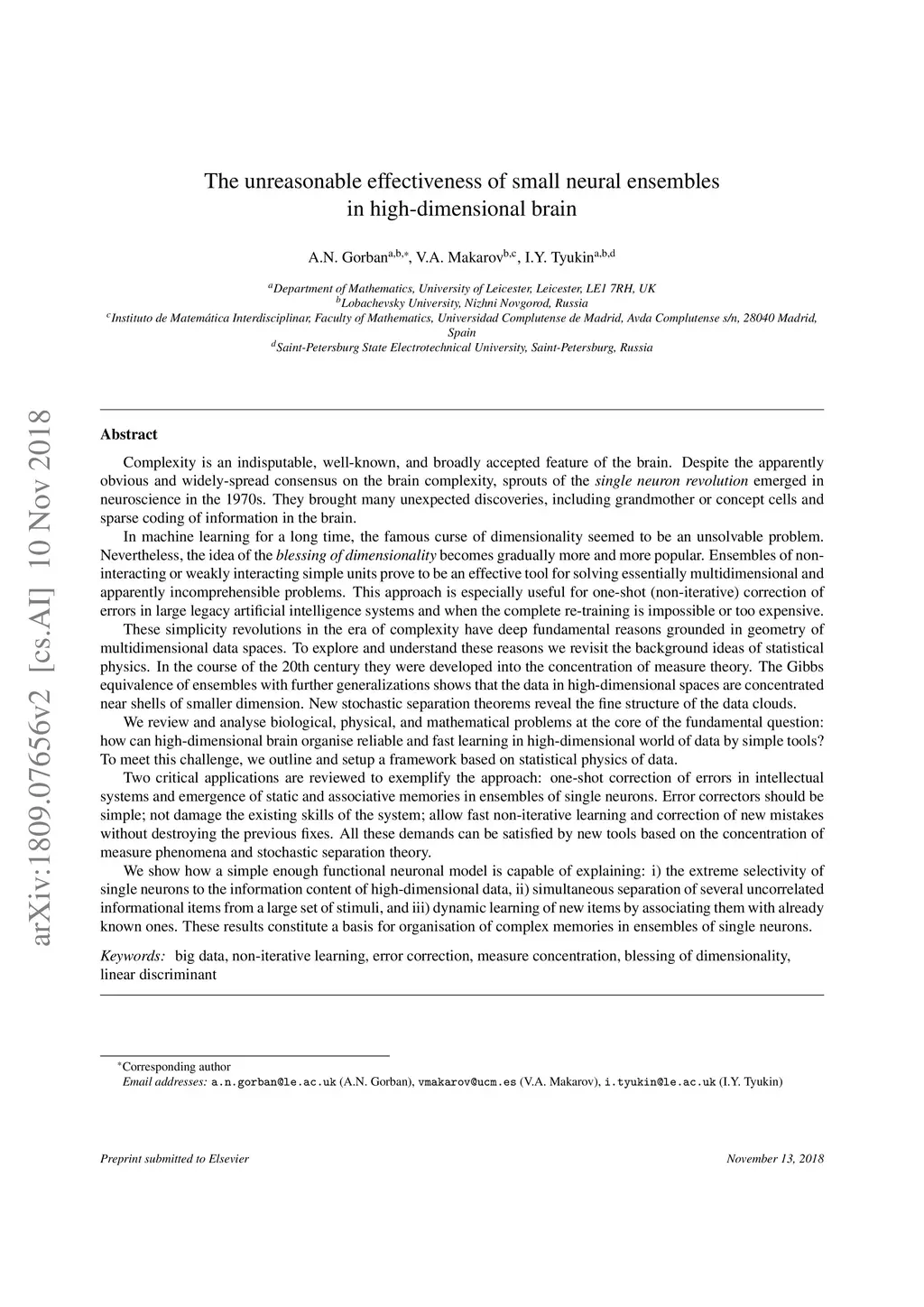 Despite the widely-spread consensus on the brain complexity, sprouts of the single neuron revolution emerged in neuroscience in the 1970s. They brought many unexpected discoveries, including grandmother or concept cells and sparse coding of information in the brain. In machine learning for a long time, the famous curse of dimensionality seemed to be an unsolvable problem. Nevertheless, the idea of the blessing of dimensionality becomes gradually more and more popular. Ensembles of non-interacting or weakly interacting simple units prove to be an effective tool for solving essentially multidimensional problems. This approach is especially useful for one-shot (non-iterative) correction of errors in large legacy artificial intelligence systems. These simplicity revolutions in the era of complexity have deep fundamental reasons grounded in geometry of multidimensional data spaces. To explore and understand these reasons we revisit the background ideas of statistical physics. In the course of the 20th century they were developed into the concentration of measure theory. New stochastic separation theorems reveal the fine structure of the data clouds. We review and analyse biological, physical, and mathematical problems at the core of the fundamental question: how can high-dimensional brain organise reliable and fast learning in high-dimensional world of data by simple tools? Two critical applications are reviewed to exemplify the approach: one-shot correction of errors in intellectual systems and emergence of static and associative memories in ensembles of single neurons.