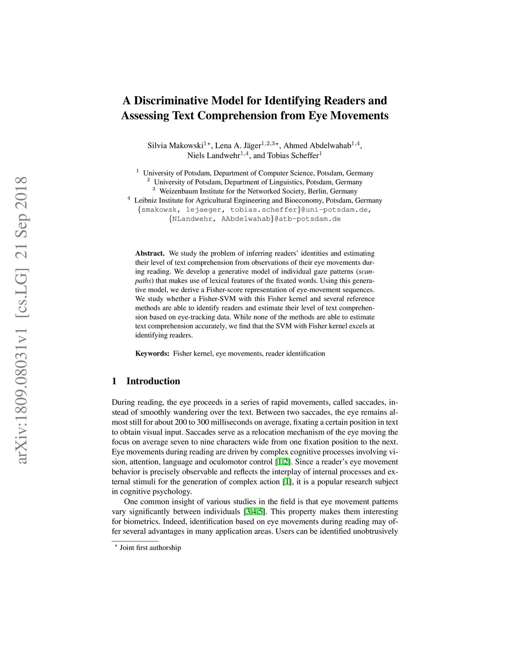 We study the problem of inferring readers' identities and estimating their level of text comprehension from observations of their eye movements during reading. We develop a generative model of individual gaze patterns (scanpaths) that makes use of lexical features of the fixated words. Using this generative model, we derive a Fisher-score representation of eye-movement sequences. We study whether a Fisher-SVM with this Fisher kernel and several reference methods are able to identify readers and estimate their level of text comprehension based on eye-tracking data. While none of the methods are able to estimate text comprehension accurately, we find that the SVM with Fisher kernel excels at identifying readers.
