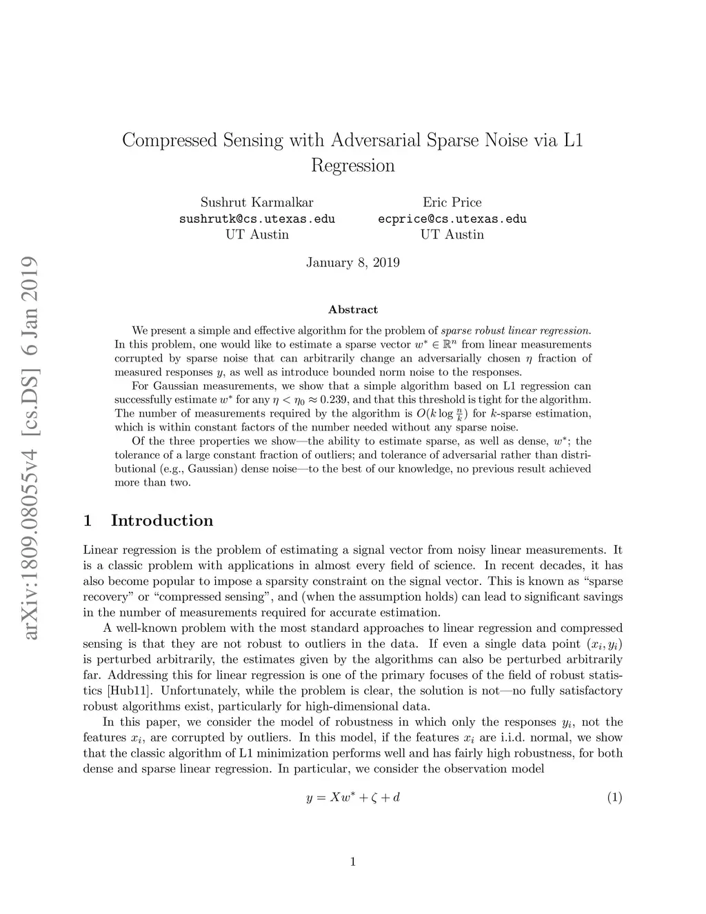 We present a simple and effective algorithm for the problem of \emph{sparse robust linear regression}. In this problem, one would like to estimate a sparse vector from linear measurements corrupted by sparse noise that can arbitrarily change an adversarially chosen fraction of measured responses , as well as introduce bounded norm noise to the responses. For Gaussian measurements, we show that a simple algorithm based on L1 regression can successfully estimate for any , and that this threshold is tight for the algorithm. The number of measurements required by the algorithm is for -sparse estimation, which is within constant factors of the number needed without any sparse noise. Of the three properties we show---the ability to estimate sparse, as well as dense, ; the tolerance of a large constant fraction of outliers; and tolerance of adversarial rather than distributional (e.g., Gaussian) dense noise---to the best of our knowledge, no previous result achieved more than two.