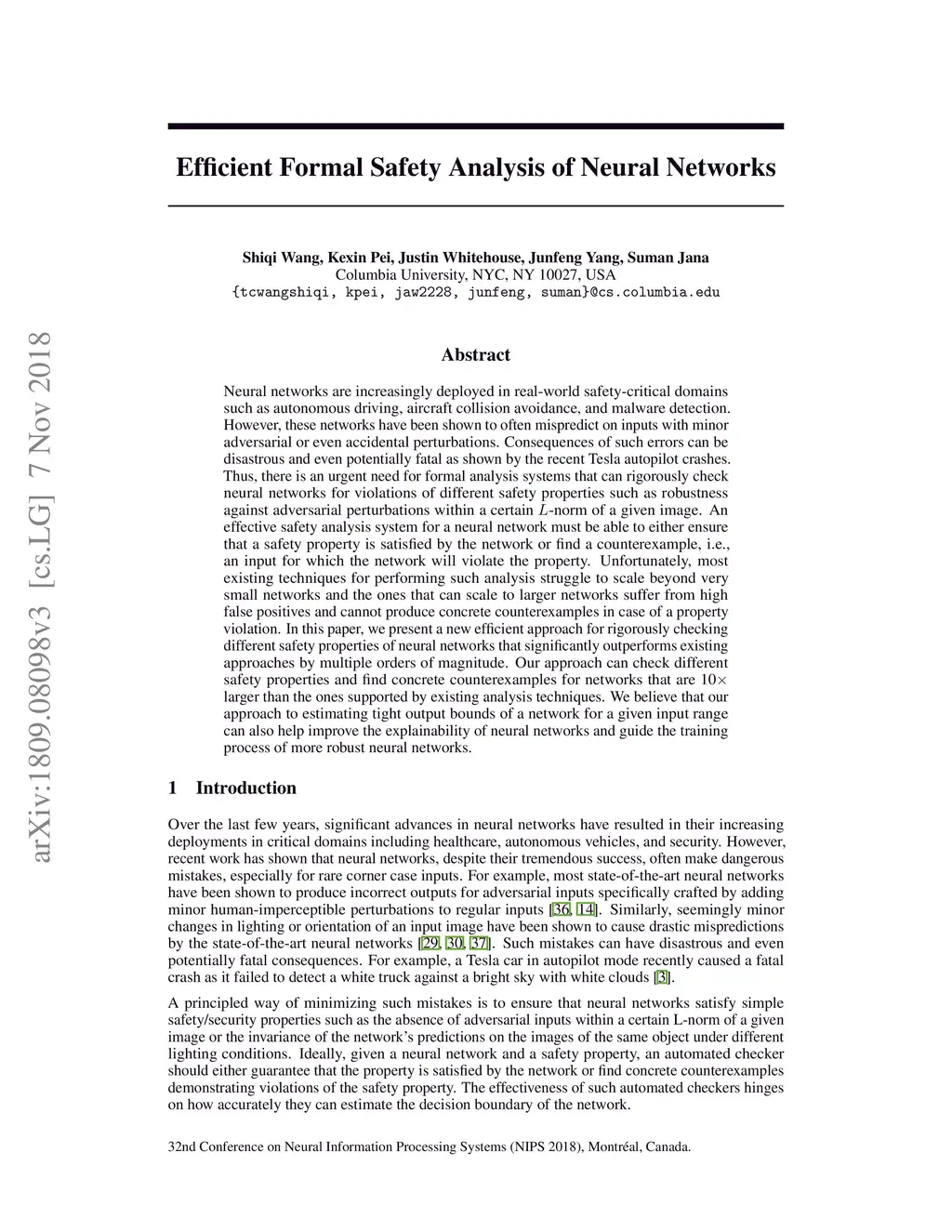 Neural networks are increasingly deployed in real-world safety-critical domains such as autonomous driving, aircraft collision avoidance, and malware detection. However, these networks have been shown to often mispredict on inputs with minor adversarial or even accidental perturbations. Consequences of such errors can be disastrous and even potentially fatal as shown by the recent Tesla autopilot crash. Thus, there is an urgent need for formal analysis systems that can rigorously check neural networks for violations of different safety properties such as robustness against adversarial perturbations within a certain -norm of a given image. An effective safety analysis system for a neural network must be able to either ensure that a safety property is satisfied by the network or find a counterexample, i.e., an input for which the network will violate the property. Unfortunately, most existing techniques for performing such analysis struggle to scale beyond very small networks and the ones that can scale to larger networks suffer from high false positives and cannot produce concrete counterexamples in case of a property violation. In this paper, we present a new efficient approach for rigorously checking different safety properties of neural networks that significantly outperforms existing approaches by multiple orders of magnitude. Our approach can check different safety properties and find concrete counterexamples for networks that are 10 larger than the ones supported by existing analysis techniques. We believe that our approach to estimating tight output bounds of a network for a given input range can also help improve the explainability of neural networks and guide the training process of more robust neural networks.