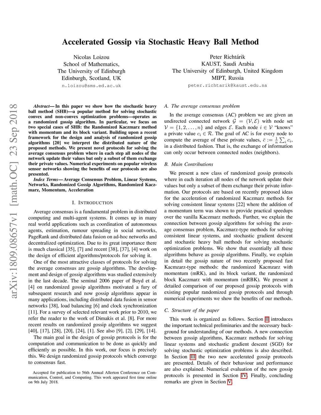 In this paper we show how the stochastic heavy ball method (SHB) -- a popular method for solving stochastic convex and non-convex optimization problems --operates as a randomized gossip algorithm. In particular, we focus on two special cases of SHB: the Randomized Kaczmarz method with momentum and its block variant. Building upon a recent framework for the design and analysis of randomized gossip algorithms, [Loizou Richtarik, 2016] we interpret the distributed nature of the proposed methods. We present novel protocols for solving the average consensus problem where in each step all nodes of the network update their values but only a subset of them exchange their private values. Numerical experiments on popular wireless sensor networks showing the benefits of our protocols are also presented.