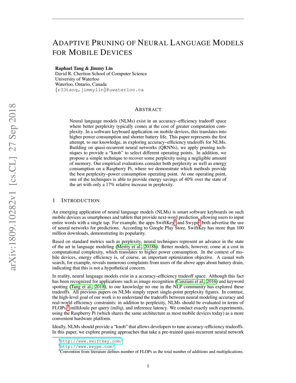 Neural language models (NLMs) exist in an accuracy-efficiency tradeoff space where better perplexity typically comes at the cost of greater computation complexity. In a software keyboard application on mobile devices, this translates into higher power consumption and shorter battery life. This paper represents the first attempt, to our knowledge, in exploring accuracy-efficiency tradeoffs for NLMs. Building on quasi-recurrent neural networks (QRNNs), we apply pruning techniques to provide a "knob" to select different operating points. In addition, we propose a simple technique to recover some perplexity using a negligible amount of memory. Our empirical evaluations consider both perplexity as well as energy consumption on a Raspberry Pi, where we demonstrate which methods provide the best perplexity-power consumption operating point. At one operating point, one of the techniques is able to provide energy savings of 40% over the state of the art with only a 17% relative increase in perplexity.