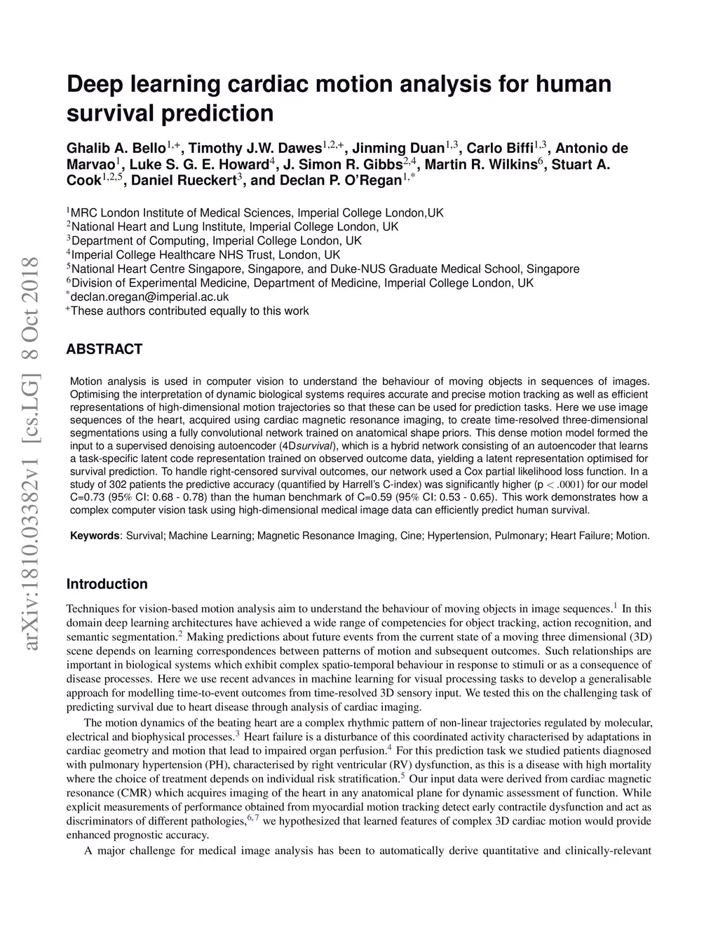 Motion analysis is used in computer vision to understand the behaviour of moving objects in sequences of images. Optimising the interpretation of dynamic biological systems requires accurate and precise motion tracking as well as efficient representations of high-dimensional motion trajectories so that these can be used for prediction tasks. Here we use image sequences of the heart, acquired using cardiac magnetic resonance imaging, to create time-resolved three-dimensional segmentations using a fully convolutional network trained on anatomical shape priors. This dense motion model formed the input to a supervised denoising autoencoder (4Dsurvival), which is a hybrid network consisting of an autoencoder that learns a task-specific latent code representation trained on observed outcome data, yielding a latent representation optimised for survival prediction. To handle right-censored survival outcomes, our network used a Cox partial likelihood loss function. In a study of 302 patients the predictive accuracy (quantified by Harrell's C-index) was significantly higher (p < .0001) for our model C=0.73 (95 CI: 0.68 - 0.78) than the human benchmark of C=0.59 (95 CI: 0.53 - 0.65). This work demonstrates how a complex computer vision task using high-dimensional medical image data can efficiently predict human survival.