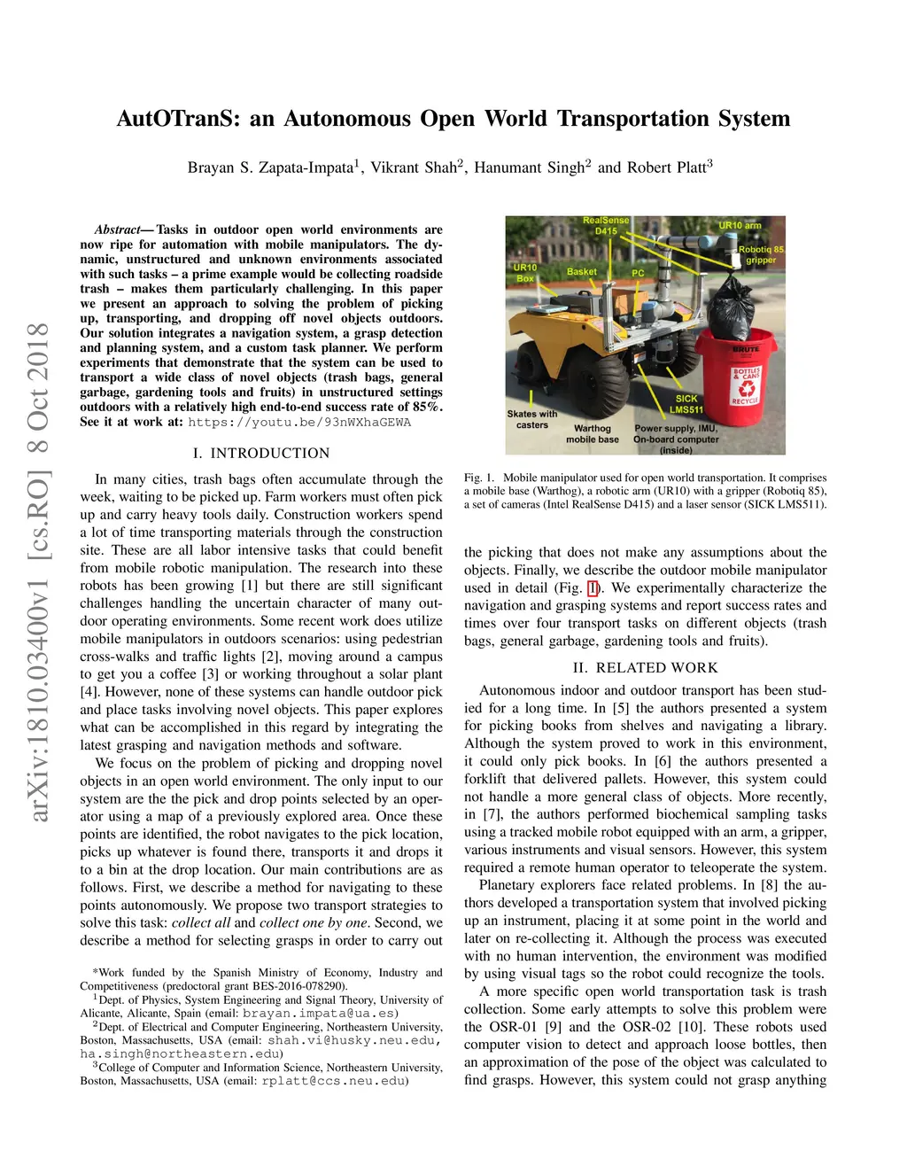 Tasks in outdoor open world environments are now ripe for automation with mobile manipulators. The dynamic, unstructured and unknown environments associated with such tasks -- a prime example would be collecting roadside trash -- makes them particularly challenging. In this paper we present an approach to solving the problem of picking up, transporting, and dropping off novel objects outdoors. Our solution integrates a navigation system, a grasp detection and planning system, and a custom task planner. We perform experiments that demonstrate that the system can be used to transport a wide class of novel objects (trash bags, general garbage, gardening tools and fruits) in unstructured settings outdoors with a relatively high end-to-end success rate of 85%. See it at work at: https://youtu.be/93nWXhaGEWA