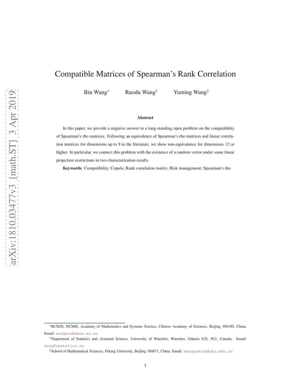 In this paper, we provide a negative answer to a long-standing open problem on the compatibility of Spearman's rho matrices. Following an equivalence of Spearman's rho matrices and linear correlation matrices for dimensions up to 9 in the literature, we show non-equivalence for dimensions 12 or higher. In particular, we connect this problem with the existence of a random vector under some linear projection restrictions in two characterization results.