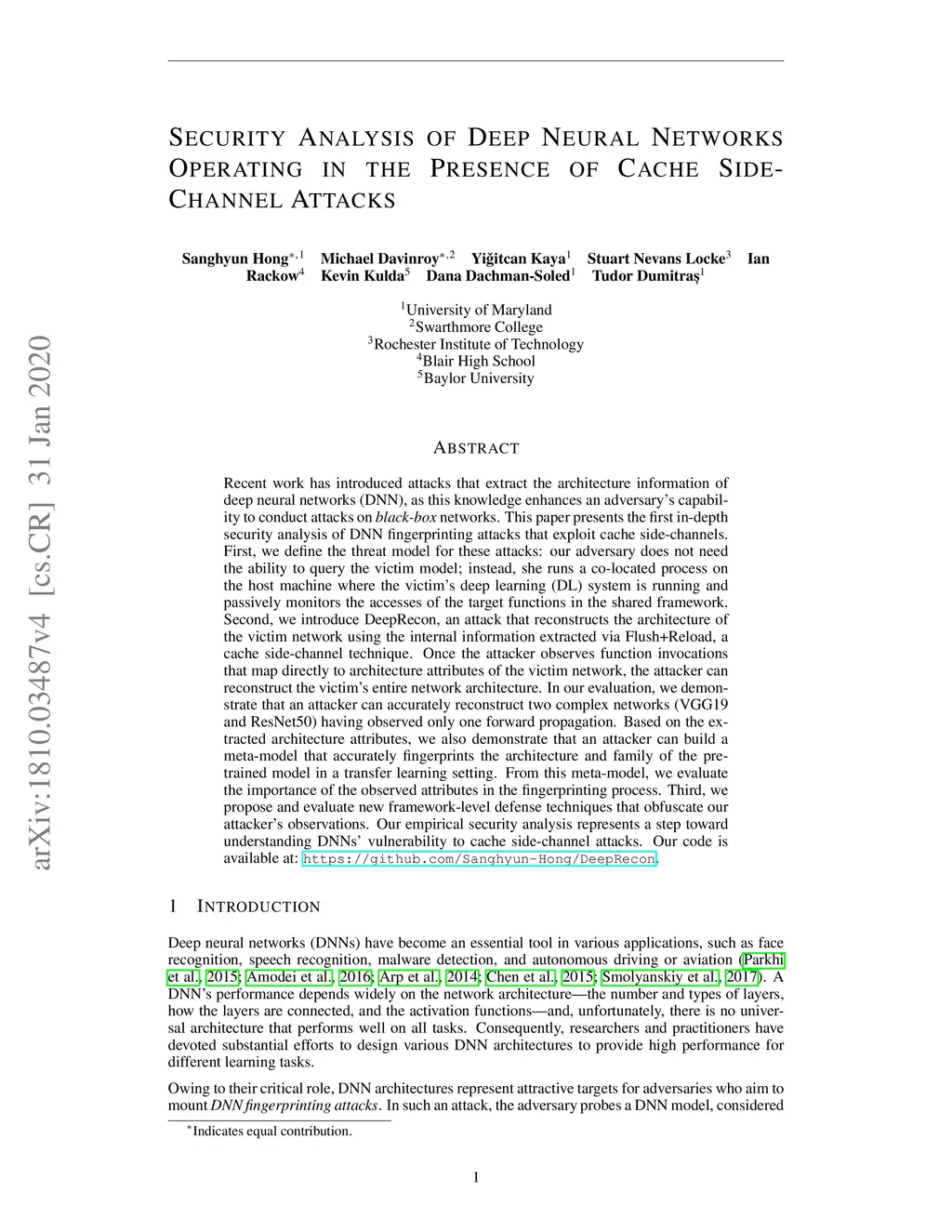 Recent work has introduced attacks that extract the architecture information of deep neural networks (DNN), as this knowledge enhances an adversary's capability to conduct black-box attacks against the model. This paper presents the first in-depth security analysis of DNN fingerprinting attacks that exploit cache side-channels. First, we define the threat model for these attacks: our adversary does not need the ability to query the victim model; instead, she runs a co-located process on the host machine victim's deep learning (DL) system is running and passively monitors the accesses of the target functions in the shared framework. Second, we introduce DeepRecon, an attack that reconstructs the architecture of the victim network by using the internal information extracted via Flush+Reload, a cache side-channel technique. Once the attacker observes function invocations that map directly to architecture attributes of the victim network, the attacker can reconstruct the victim's entire network architecture. In our evaluation, we demonstrate that an attacker can accurately reconstruct two complex networks (VGG19 and ResNet50) having observed only one forward propagation. Based on the extracted architecture attributes, we also demonstrate that an attacker can build a meta-model that accurately fingerprints the architecture and family of the pre-trained model in a transfer learning setting. From this meta-model, we evaluate the importance of the observed attributes in the fingerprinting process. Third, we propose and evaluate new framework-level defense techniques that obfuscate our attacker's observations. Our empirical security analysis represents a step toward understanding the DNNs' vulnerability to cache side-channel attacks.