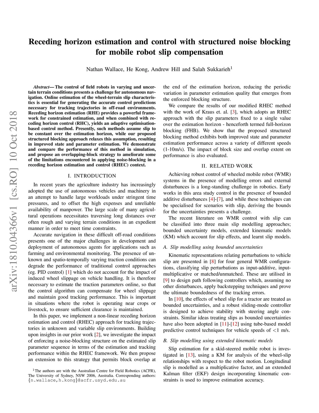 The control of field robots in varying and uncertain terrain conditions presents a challenge for autonomous navigation. Online estimation of the wheel-terrain slip characteristics is essential for generating the accurate control predictions necessary for tracking trajectories in off-road environments. Receding horizon estimation (RHE) provides a powerful framework for constrained estimation, and when combined with receding horizon control (RHC), yields an adaptive optimisation-based control method. Presently, such methods assume slip to be constant over the estimation horizon, while our proposed structured blocking approach relaxes this assumption, resulting in improved state and parameter estimation. We demonstrate and compare the performance of this method in simulation, and propose an overlapping-block strategy to ameliorate some of the limitations encountered in applying noise-blocking in a receding horizon estimation and control (RHEC) context.