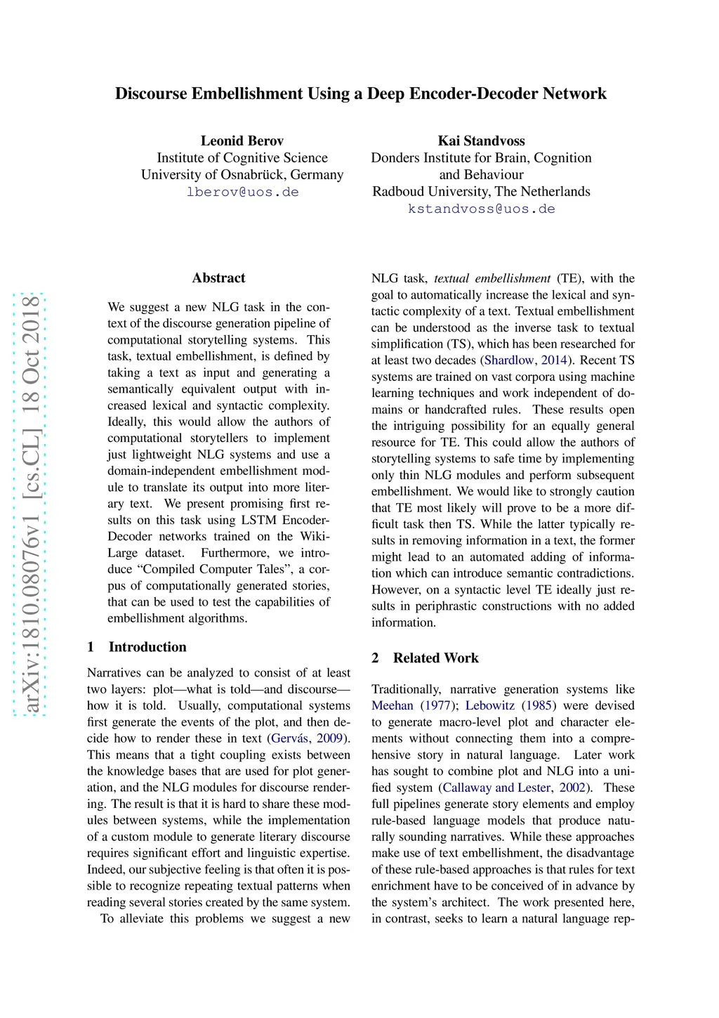 We suggest a new NLG task in the context of the discourse generation pipeline of computational storytelling systems. This task, textual embellishment, is defined by taking a text as input and generating a semantically equivalent output with increased lexical and syntactic complexity. Ideally, this would allow the authors of computational storytellers to implement just lightweight NLG systems and use a domain-independent embellishment module to translate its output into more literary text. We present promising first results on this task using LSTM Encoder-Decoder networks trained on the WikiLarge dataset. Furthermore, we introduce "Compiled Computer Tales", a corpus of computationally generated stories, that can be used to test the capabilities of embellishment algorithms.