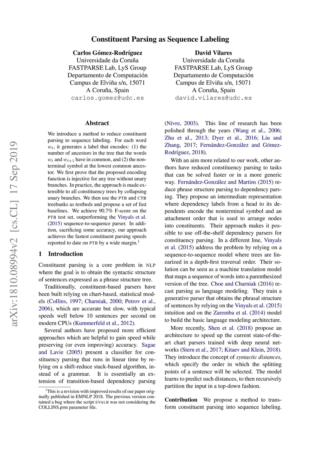 We introduce a method to reduce constituent parsing to sequence labeling. For each word w_t, it generates a label that encodes: (1) the number of ancestors in the tree that the words w_t and w_{t+1} have in common, and (2) the nonterminal symbol at the lowest common ancestor. We first prove that the proposed encoding function is injective for any tree without unary branches. In practice, the approach is made extensible to all constituency trees by collapsing unary branches. We then use the PTB and CTB treebanks as testbeds and propose a set of fast baselines. We achieve 90.7% F-score on the PTB test set, outperforming the Vinyals et al. (2015) sequence-to-sequence parser. In addition, sacrificing some accuracy, our approach achieves the fastest constituent parsing speeds reported to date on PTB by a wide margin.