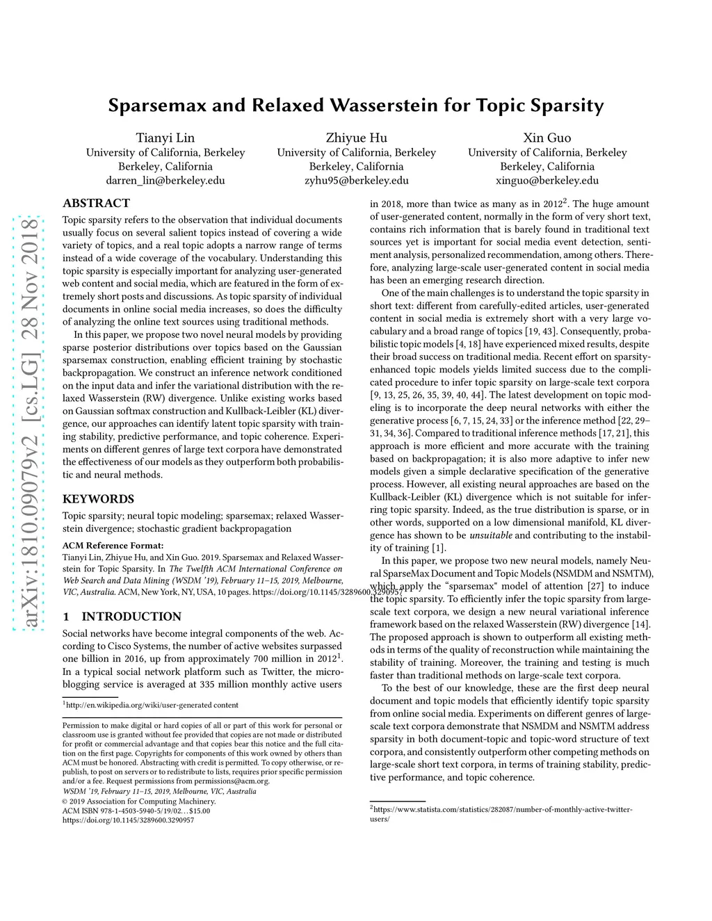 Topic sparsity refers to the observation that individual documents usually focus on several salient topics instead of covering a wide variety of topics, and a real topic adopts a narrow range of terms instead of a wide coverage of the vocabulary. Understanding this topic sparsity is especially important for analyzing user-generated web content and social media, which are featured in the form of extremely short posts and discussions. As topic sparsity of individual documents in online social media increases, so does the difficulty of analyzing the online text sources using traditional methods. In this paper, we propose two novel neural models by providing sparse posterior distributions over topics based on the Gaussian sparsemax construction, enabling efficient training by stochastic backpropagation. We construct an inference network conditioned on the input data and infer the variational distribution with the relaxed Wasserstein (RW) divergence. Unlike existing works based on Gaussian softmax construction and Kullback-Leibler (KL) divergence, our approaches can identify latent topic sparsity with training stability, predictive performance, and topic coherence. Experiments on different genres of large text corpora have demonstrated the effectiveness of our models as they outperform both probabilistic and neural methods.
