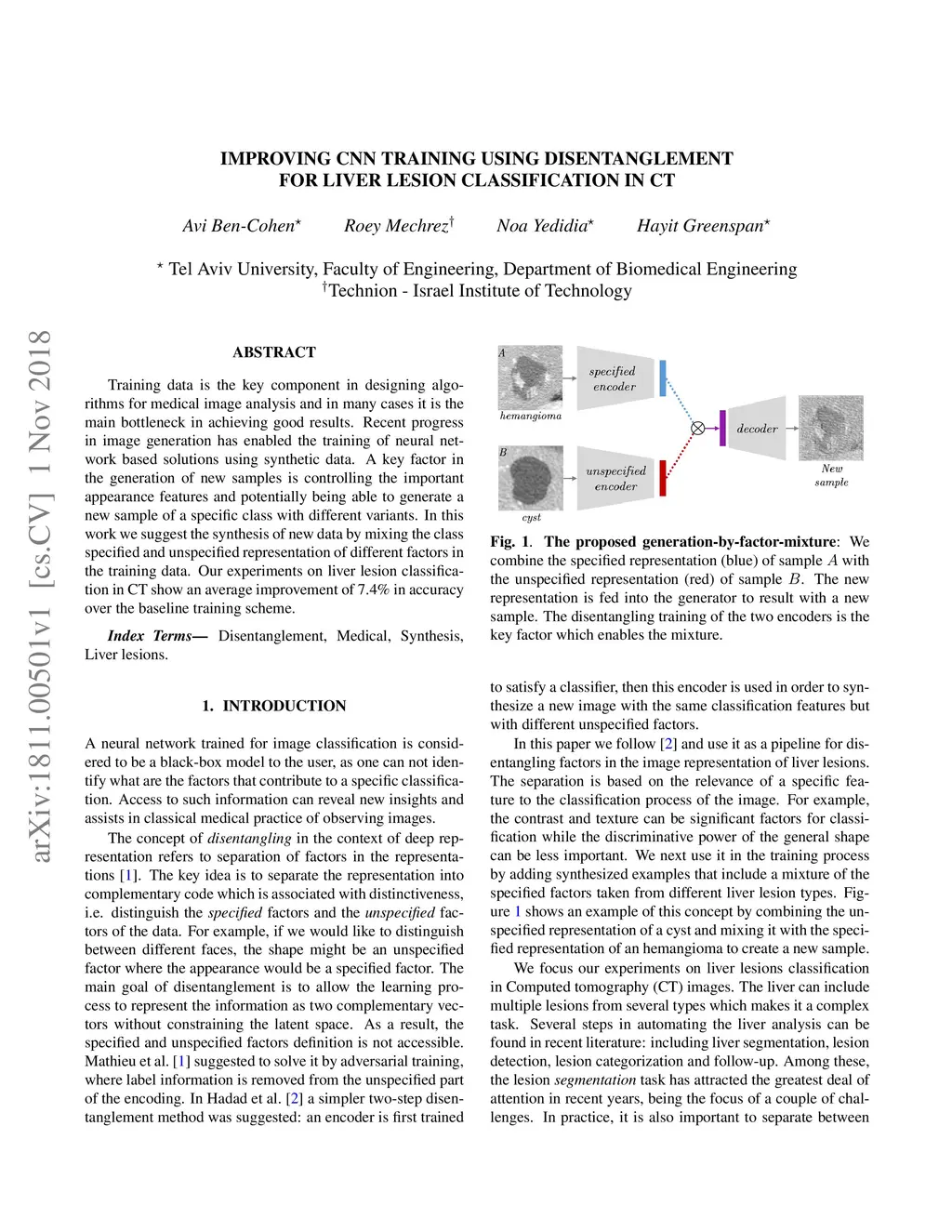 Training data is the key component in designing algorithms for medical image analysis and in many cases it is the main bottleneck in achieving good results. Recent progress in image generation has enabled the training of neural network based solutions using synthetic data. A key factor in the generation of new samples is controlling the important appearance features and potentially being able to generate a new sample of a specific class with different variants. In this work we suggest the synthesis of new data by mixing the class specified and unspecified representation of different factors in the training data. Our experiments on liver lesion classification in CT show an average improvement of 7.4% in accuracy over the baseline training scheme.