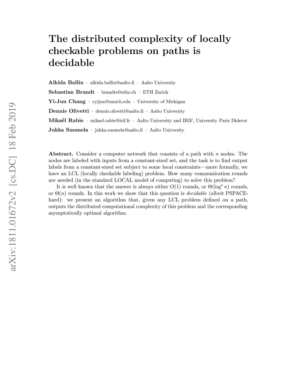 Consider a computer network that consists of a path with nodes. The nodes are labeled with inputs from a constant-sized set, and the task is to find output labels from a constant-sized set subject to some local constraints---more formally, we have an LCL (locally checkable labeling) problem. How many communication rounds are needed (in the standard LOCAL model of computing) to solve this problem? It is well known that the answer is always either rounds, or rounds, or rounds. In this work we show that this question is decidable (albeit PSPACE-hard): we present an algorithm that, given any LCL problem defined on a path, outputs the distributed computational complexity of this problem and the corresponding asymptotically optimal algorithm.