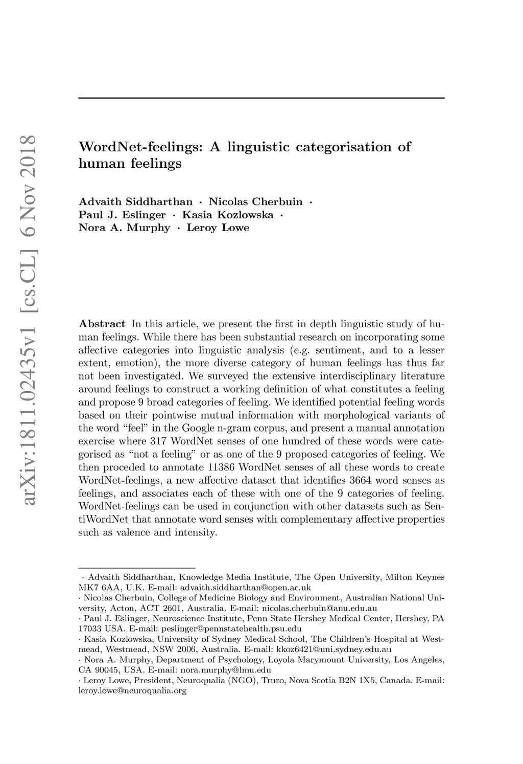In this article, we present the first in depth linguistic study of human feelings. While there has been substantial research on incorporating some affective categories into linguistic analysis (e.g. sentiment, and to a lesser extent, emotion), the more diverse category of human feelings has thus far not been investigated. We surveyed the extensive interdisciplinary literature around feelings to construct a working definition of what constitutes a feeling and propose 9 broad categories of feeling. We identified potential feeling words based on their pointwise mutual information with morphological variants of the word `feel' in the Google n-gram corpus, and present a manual annotation exercise where 317 WordNet senses of one hundred of these words were categorised as `not a feeling' or as one of the 9 proposed categories of feeling. We then proceeded to annotate 11386 WordNet senses of all these words to create WordNet-feelings, a new affective dataset that identifies 3664 word senses as feelings, and associates each of these with one of the 9 categories of feeling. WordNet-feelings can be used in conjunction with other datasets such as SentiWordNet that annotate word senses with complementary affective properties such as valence and intensity.