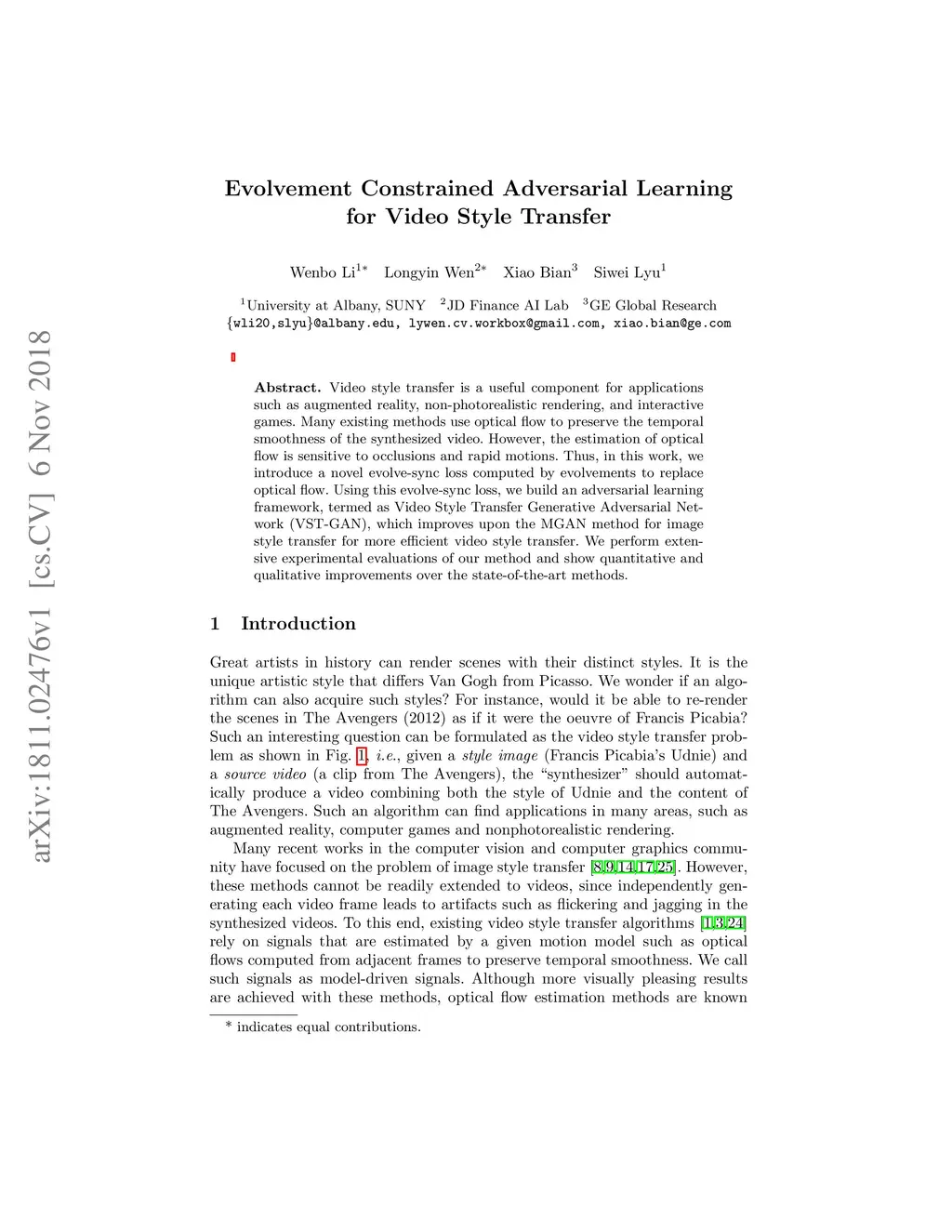 Video style transfer is a useful component for applications such as augmented reality, non-photorealistic rendering, and interactive games. Many existing methods use optical flow to preserve the temporal smoothness of the synthesized video. However, the estimation of optical flow is sensitive to occlusions and rapid motions. Thus, in this work, we introduce a novel evolve-sync loss computed by evolvements to replace optical flow. Using this evolve-sync loss, we build an adversarial learning framework, termed as Video Style Transfer Generative Adversarial Network (VST-GAN), which improves upon the MGAN method for image style transfer for more efficient video style transfer. We perform extensive experimental evaluations of our method and show quantitative and qualitative improvements over the state-of-the-art methods.