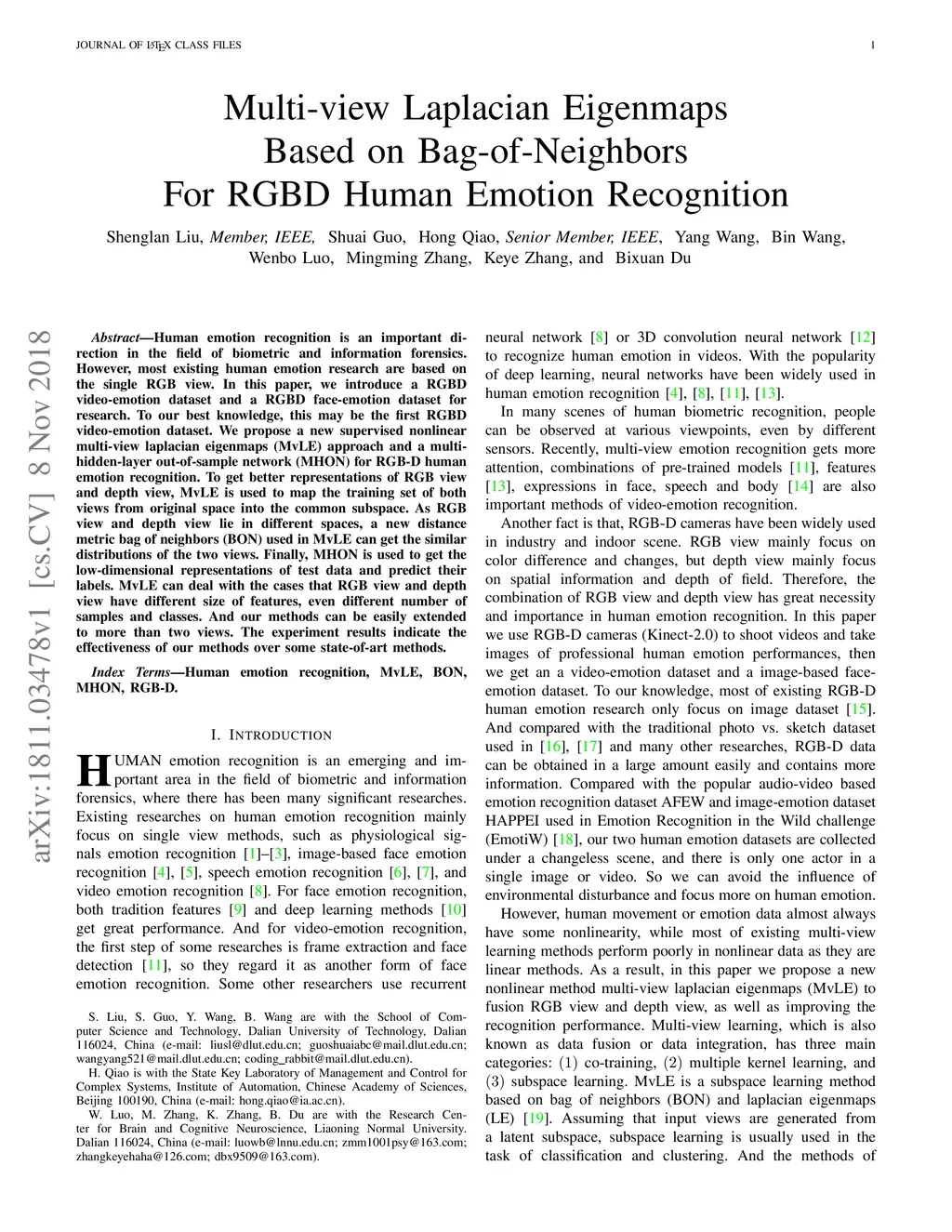 Human emotion recognition is an important direction in the field of biometric and information forensics. However, most existing human emotion research are based on the single RGB view. In this paper, we introduce a RGBD video-emotion dataset and a RGBD face-emotion dataset for research. To our best knowledge, this may be the first RGBD video-emotion dataset. We propose a new supervised nonlinear multi-view laplacian eigenmaps (MvLE) approach and a multihidden-layer out-of-sample network (MHON) for RGB-D humanemotion recognition. To get better representations of RGB view and depth view, MvLE is used to map the training set of both views from original space into the common subspace. As RGB view and depth view lie in different spaces, a new distance metric bag of neighbors (BON) used in MvLE can get the similar distributions of the two views. Finally, MHON is used to get the low-dimensional representations of test data and predict their labels. MvLE can deal with the cases that RGB view and depth view have different size of features, even different number of samples and classes. And our methods can be easily extended to more than two views. The experiment results indicate the effectiveness of our methods over some state-of-art methods.