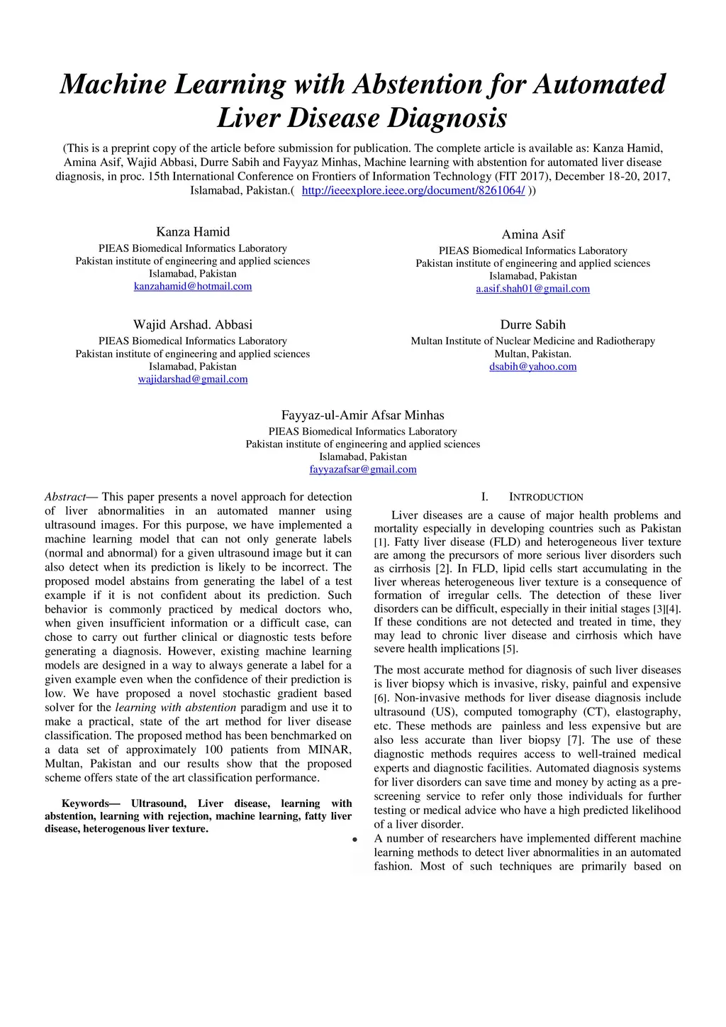This paper presents a novel approach for detection of liver abnormalities in an automated manner using ultrasound images. For this purpose, we have implemented a machine learning model that can not only generate labels (normal and abnormal) for a given ultrasound image but it can also detect when its prediction is likely to be incorrect. The proposed model abstains from generating the label of a test example if it is not confident about its prediction. Such behavior is commonly practiced by medical doctors who, when given insufficient information or a difficult case, can chose to carry out further clinical or diagnostic tests before generating a diagnosis. However, existing machine learning models are designed in a way to always generate a label for a given example even when the confidence of their prediction is low. We have proposed a novel stochastic gradient based solver for the learning with abstention paradigm and use it to make a practical, state of the art method for liver disease classification. The proposed method has been benchmarked on a data set of approximately 100 patients from MINAR, Multan, Pakistan and our results show that the proposed scheme offers state of the art classification performance.