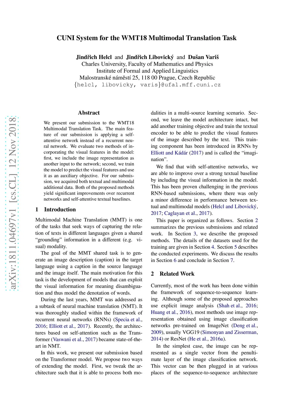 We present our submission to the WMT18 Multimodal Translation Task. The main feature of our submission is applying a self-attentive network instead of a recurrent neural network. We evaluate two methods of incorporating the visual features in the model: first, we include the image representation as another input to the network; second, we train the model to predict the visual features and use it as an auxiliary objective. For our submission, we acquired both textual and multimodal additional data. Both of the proposed methods yield significant improvements over recurrent networks and self-attentive textual baselines.