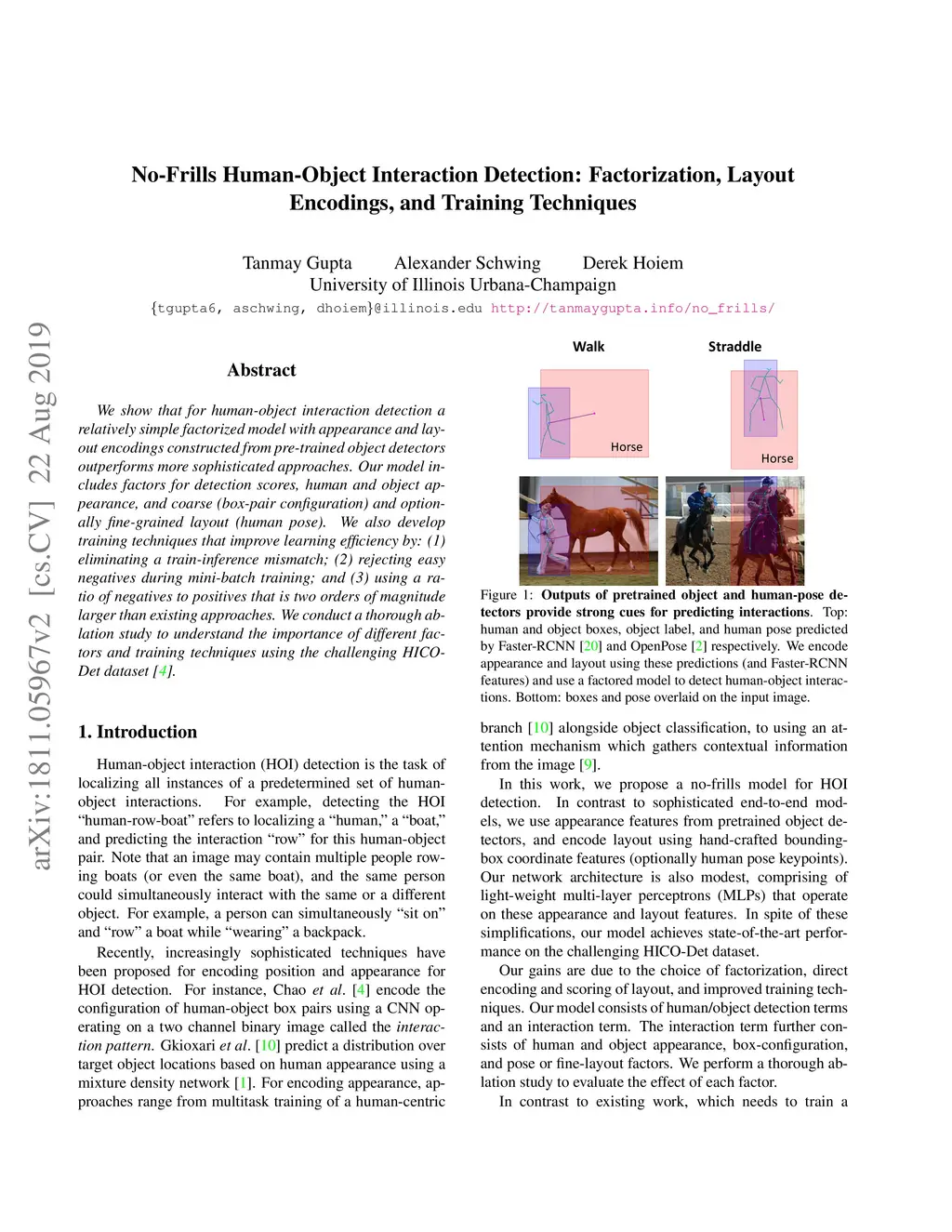 We show that for human-object interaction detection a relatively simple factorized model with appearance and layout encodings constructed from pre-trained object detectors outperforms more sophisticated approaches. Our model includes factors for detection scores, human and object appearance, and coarse (box-pair configuration) and optionally fine-grained layout (human pose). We also develop training techniques that improve learning efficiency by: (1) eliminating a train-inference mismatch; (2) rejecting easy negatives during mini-batch training; and (3) using a ratio of negatives to positives that is two orders of magnitude larger than existing approaches. We conduct a thorough ablation study to understand the importance of different factors and training techniques using the challenging HICO-Det dataset.