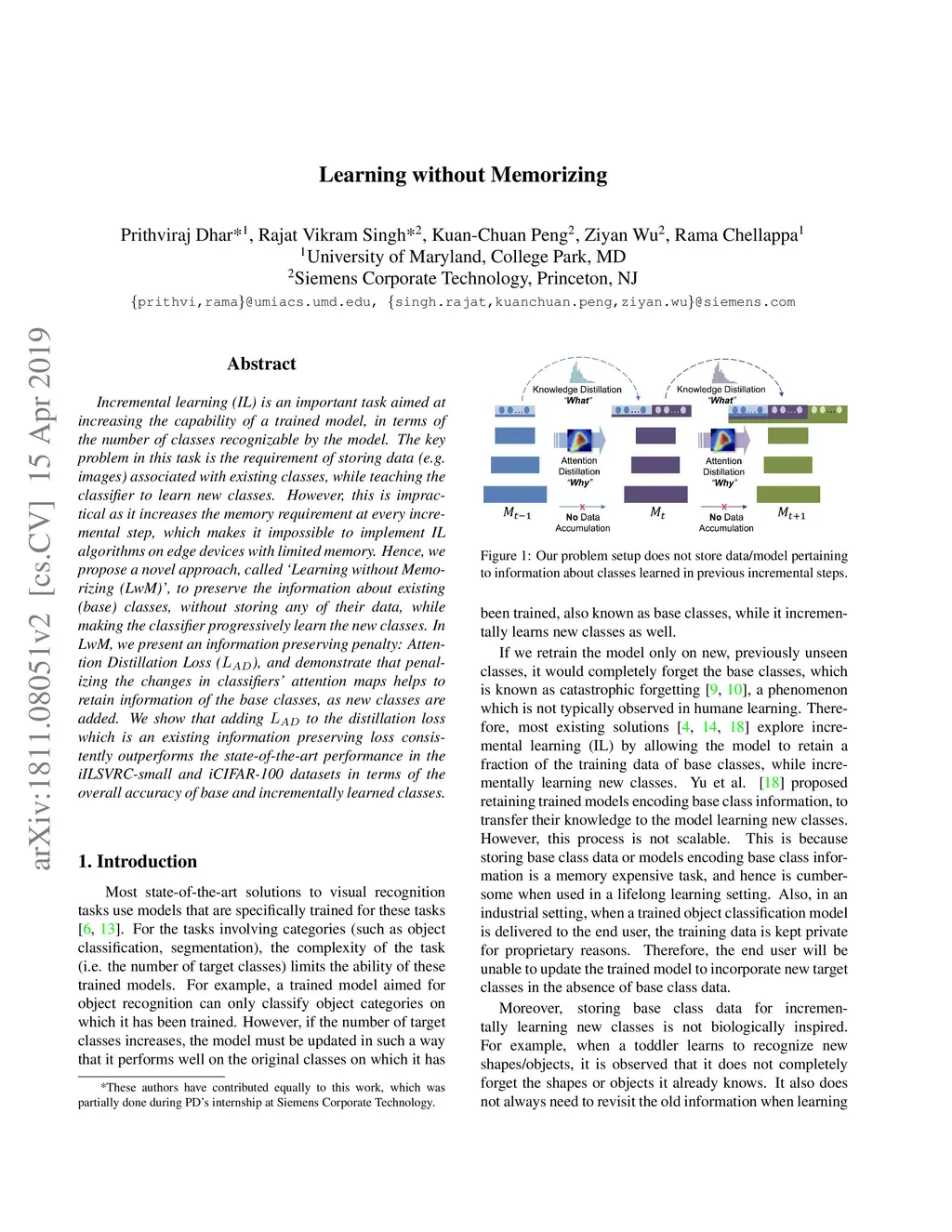 Incremental learning (IL) is an important task aimed at increasing the capability of a trained model, in terms of the number of classes recognizable by the model. The key problem in this task is the requirement of storing data (e.g. images) associated with existing classes, while teaching the classifier to learn new classes. However, this is impractical as it increases the memory requirement at every incremental step, which makes it impossible to implement IL algorithms on edge devices with limited memory. Hence, we propose a novel approach, called `Learning without Memorizing (LwM)', to preserve the information about existing (base) classes, without storing any of their data, while making the classifier progressively learn the new classes. In LwM, we present an information preserving penalty: Attention Distillation Loss (), and demonstrate that penalizing the changes in classifiers' attention maps helps to retain information of the base classes, as new classes are added. We show that adding to the distillation loss which is an existing information preserving loss consistently outperforms the state-of-the-art performance in the iILSVRC-small and iCIFAR-100 datasets in terms of the overall accuracy of base and incrementally learned classes.