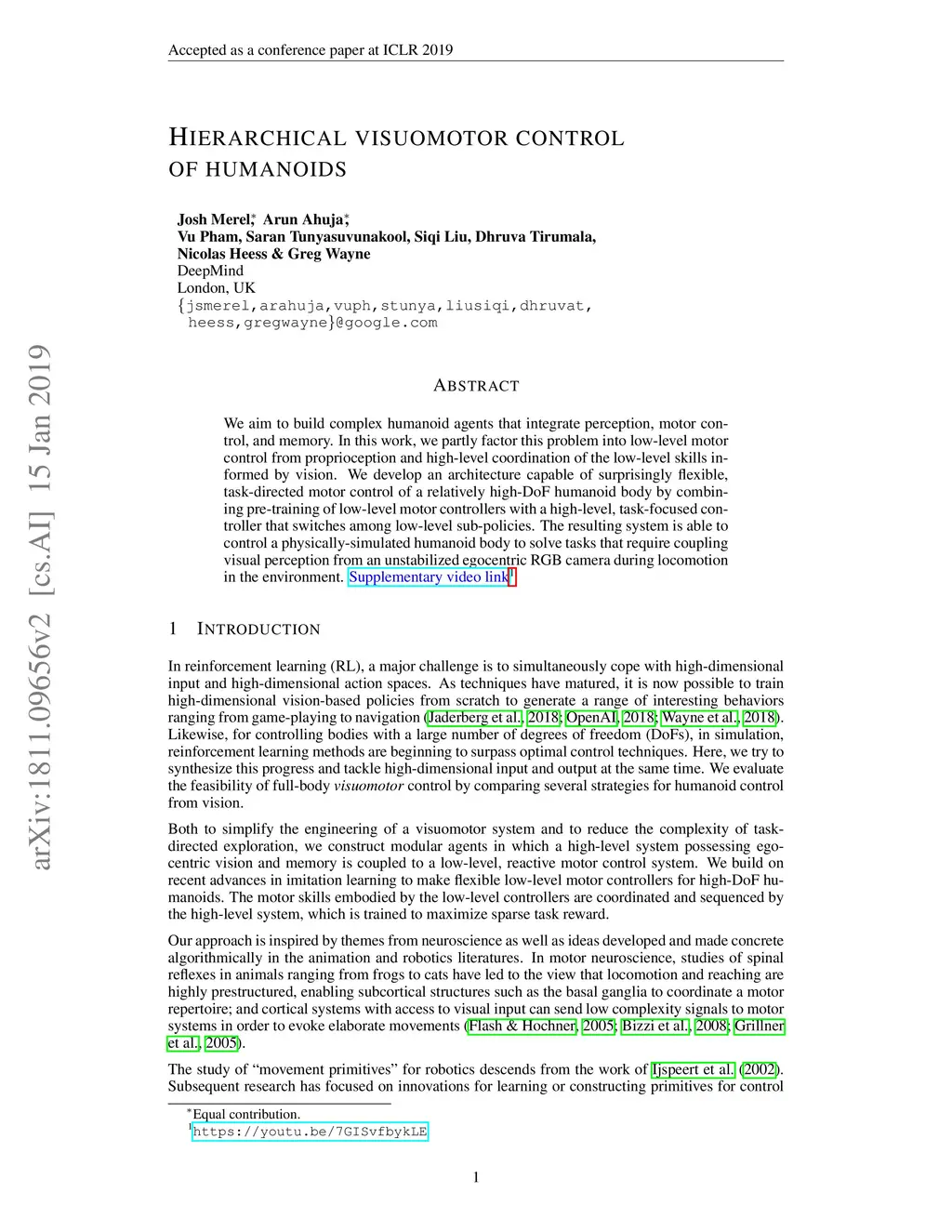 We aim to build complex humanoid agents that integrate perception, motor control, and memory. In this work, we partly factor this problem into low-level motor control from proprioception and high-level coordination of the low-level skills informed by vision. We develop an architecture capable of surprisingly flexible, task-directed motor control of a relatively high-DoF humanoid body by combining pre-training of low-level motor controllers with a high-level, task-focused controller that switches among low-level sub-policies. The resulting system is able to control a physically-simulated humanoid body to solve tasks that require coupling visual perception from an unstabilized egocentric RGB camera during locomotion in the environment. For a supplementary video link, see https://youtu.be/7GISvfbykLE .