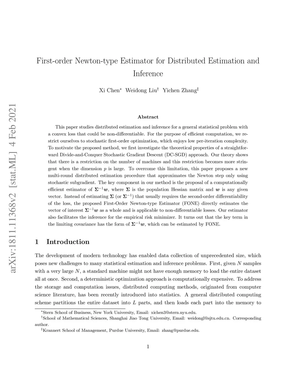 This paper studies distributed estimation and inference for a general statistical problem with a convex loss that could be non-differentiable. For the purpose of efficient computation, we restrict ourselves to stochastic first-order optimization, which enjoys low per-iteration complexity. To motivate the proposed method, we first investigate the theoretical properties of a straightforward Divide-and-Conquer Stochastic Gradient Descent (DC-SGD) approach. Our theory shows that there is a restriction on the number of machines and this restriction becomes more stringent when the dimension is large. To overcome this limitation, this paper proposes a new multi-round distributed estimation procedure that approximates the Newton step only using stochastic subgradient. The key component in our method is the proposal of a computationally efficient estimator of , where is the population Hessian matrix and is any given vector. Instead of estimating (or ) that usually requires the second-order differentiability of the loss, the proposed First-Order Newton-type Estimator (FONE) directly estimates the vector of interest as a whole and is applicable to non-differentiable losses. Our estimator also facilitates the inference for the empirical risk minimizer. It turns out that the key term in the limiting covariance has the form of , which can be estimated by FONE.