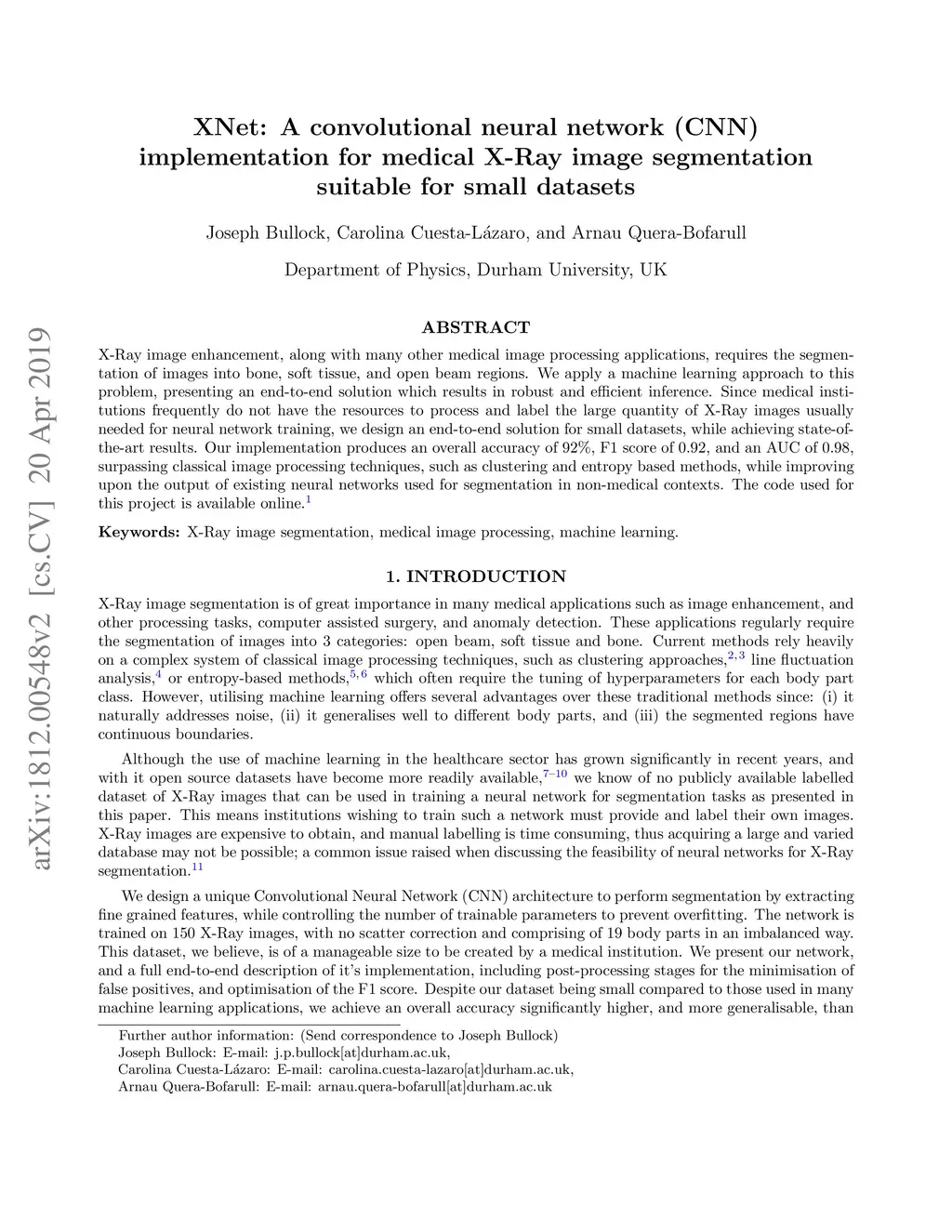 X-Ray image enhancement, along with many other medical image processing applications, requires the segmentation of images into bone, soft tissue, and open beam regions. We apply a machine learning approach to this problem, presenting an end-to-end solution which results in robust and efficient inference. Since medical institutions frequently do not have the resources to process and label the large quantity of X-Ray images usually needed for neural network training, we design an end-to-end solution for small datasets, while achieving state-of-the-art results. Our implementation produces an overall accuracy of 92%, F1 score of 0.92, and an AUC of 0.98, surpassing classical image processing techniques, such as clustering and entropy based methods, while improving upon the output of existing neural networks used for segmentation in non-medical contexts. The code used for this project is available online.