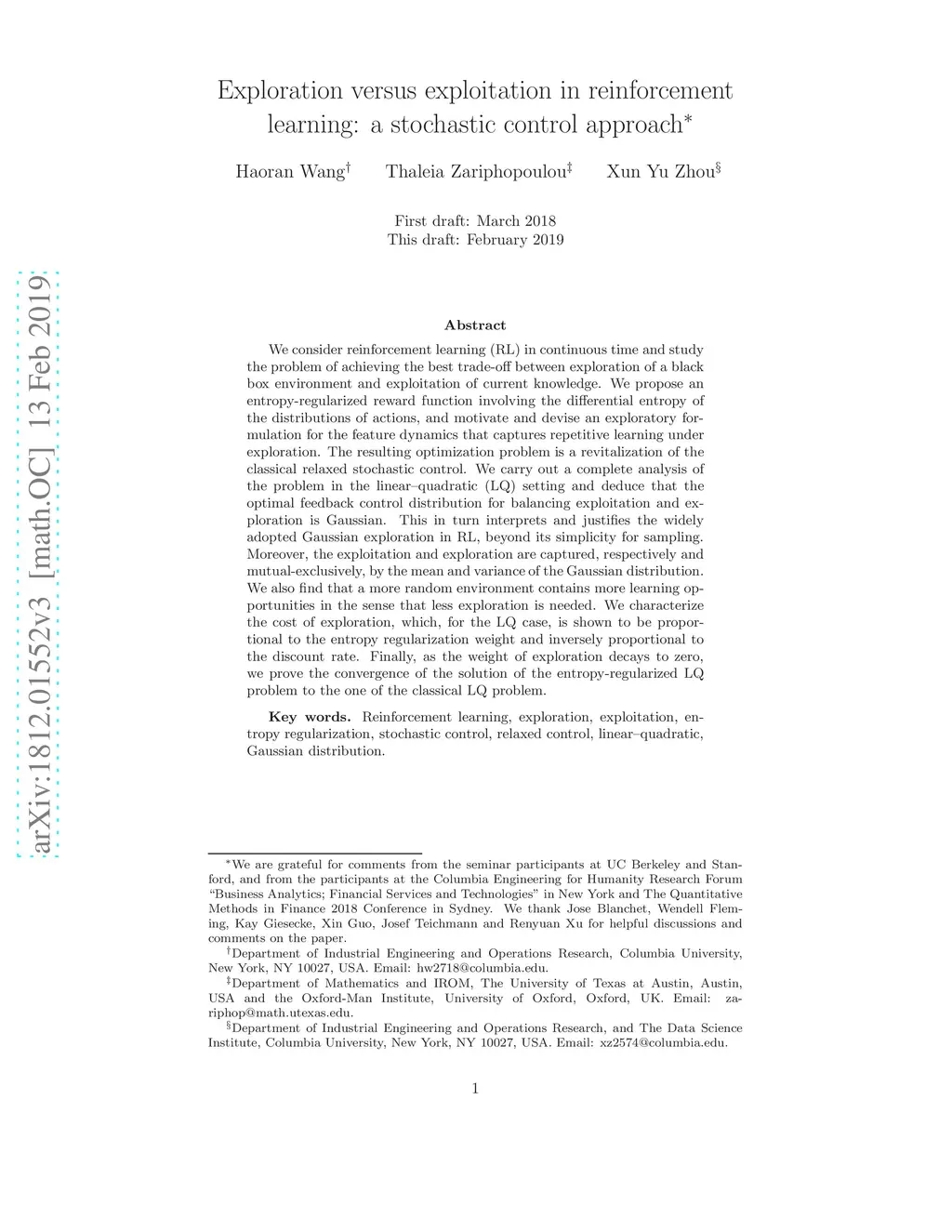 We consider reinforcement learning (RL) in continuous time and study the problem of achieving the best trade-off between exploration of a black box environment and exploitation of current knowledge. We propose an entropy-regularized reward function involving the differential entropy of the distributions of actions, and motivate and devise an exploratory formulation for the feature dynamics that captures repetitive learning under exploration. The resulting optimization problem is a revitalization of the classical relaxed stochastic control. We carry out a complete analysis of the problem in the linear--quadratic (LQ) setting and deduce that the optimal feedback control distribution for balancing exploitation and exploration is Gaussian. This in turn interprets and justifies the widely adopted Gaussian exploration in RL, beyond its simplicity for sampling. Moreover, the exploitation and exploration are captured, respectively and mutual-exclusively, by the mean and variance of the Gaussian distribution. We also find that a more random environment contains more learning opportunities in the sense that less exploration is needed. We characterize the cost of exploration, which, for the LQ case, is shown to be proportional to the entropy regularization weight and inversely proportional to the discount rate. Finally, as the weight of exploration decays to zero, we prove the convergence of the solution of the entropy-regularized LQ problem to the one of the classical LQ problem.