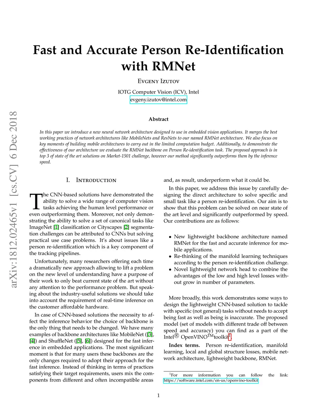 In this paper we introduce a new neural network architecture designed to use in embedded vision applications. It merges the best working practices of network architectures like MobileNets and ResNets to our named RMNet architecture. We also focus on key moments of building mobile architectures to carry out in the limited computation budget. Additionally, to demonstrate the effectiveness of our architecture we evaluate the RMNet backbone on Person Re-identification task. The proposed approach is in top 3 of state of the art solutions on Market-1501 challenge, however our method significantly outperforms them by the inference speed.