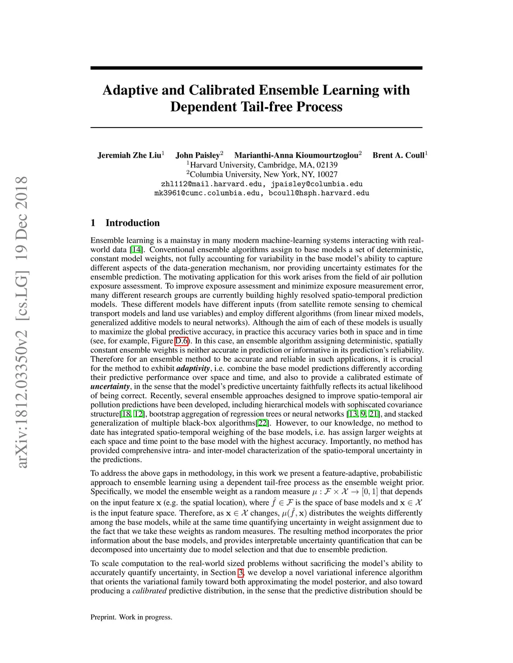 Ensemble learning is a mainstay in modern data science practice. Conventional ensemble algorithms assigns to base models a set of deterministic, constant model weights that (1) do not fully account for variations in base model accuracy across subgroups, nor (2) provide uncertainty estimates for the ensemble prediction, which could result in mis-calibrated (i.e. precise but biased) predictions that could in turn negatively impact the algorithm performance in real-word applications. In this work, we present an adaptive, probabilistic approach to ensemble learning using dependent tail-free process as ensemble weight prior. Given input feature , our method optimally combines base models based on their predictive accuracy in the feature space , and provides interpretable uncertainty estimates both in model selection and in ensemble prediction. To encourage scalable and calibrated inference, we derive a structured variational inference algorithm that jointly minimize KL objective and the model's calibration score (i.e. Continuous Ranked Probability Score (CRPS)). We illustrate the utility of our method on both a synthetic nonlinear function regression task, and on the real-world application of spatio-temporal integration of particle pollution prediction models in New England.