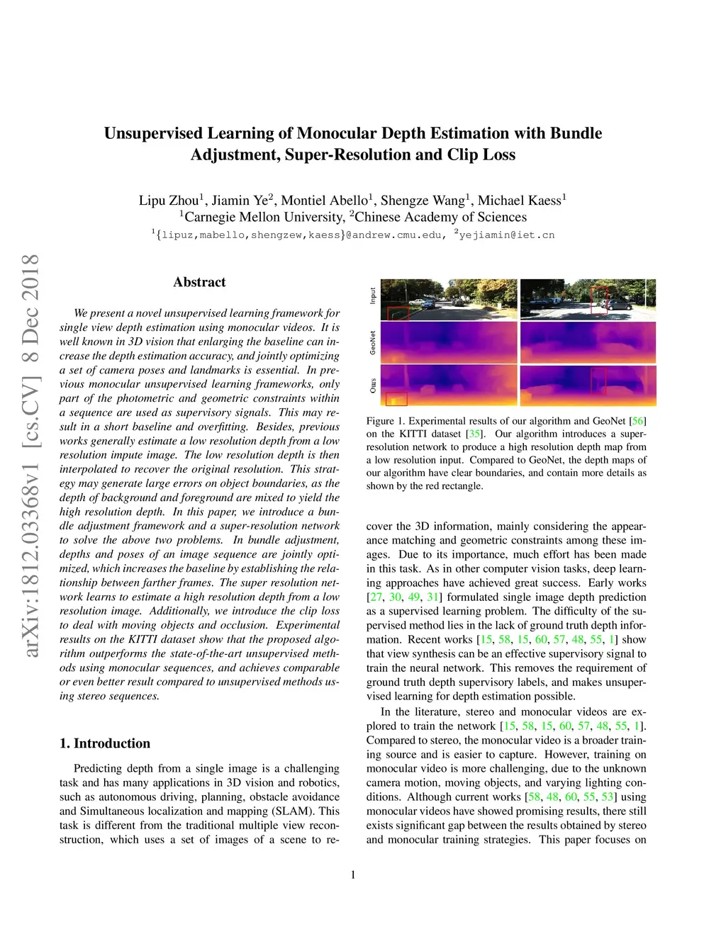 We present a novel unsupervised learning framework for single view depth estimation using monocular videos. It is well known in 3D vision that enlarging the baseline can increase the depth estimation accuracy, and jointly optimizing a set of camera poses and landmarks is essential. In previous monocular unsupervised learning frameworks, only part of the photometric and geometric constraints within a sequence are used as supervisory signals. This may result in a short baseline and overfitting. Besides, previous works generally estimate a low resolution depth from a low resolution impute image. The low resolution depth is then interpolated to recover the original resolution. This strategy may generate large errors on object boundaries, as the depth of background and foreground are mixed to yield the high resolution depth. In this paper, we introduce a bundle adjustment framework and a super-resolution network to solve the above two problems. In bundle adjustment, depths and poses of an image sequence are jointly optimized, which increases the baseline by establishing the relationship between farther frames. The super resolution network learns to estimate a high resolution depth from a low resolution image. Additionally, we introduce the clip loss to deal with moving objects and occlusion. Experimental results on the KITTI dataset show that the proposed algorithm outperforms the state-of-the-art unsupervised methods using monocular sequences, and achieves comparable or even better result compared to unsupervised methods using stereo sequences.