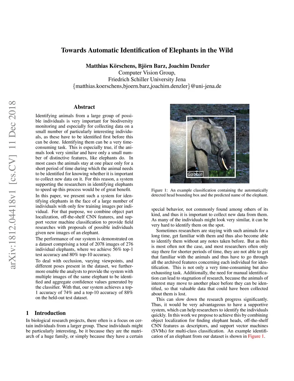 Identifying animals from a large group of possible individuals is very important for biodiversity monitoring and especially for collecting data on a small number of particularly interesting individuals, as these have to be identified first before this can be done. Identifying them can be a very time-consuming task. This is especially true, if the animals look very similar and have only a small number of distinctive features, like elephants do. In most cases the animals stay at one place only for a short period of time during which the animal needs to be identified for knowing whether it is important to collect new data on it. For this reason, a system supporting the researchers in identifying elephants to speed up this process would be of great benefit. In this paper, we present such a system for identifying elephants in the face of a large number of individuals with only few training images per individual. For that purpose, we combine object part localization, off-the-shelf CNN features, and support vector machine classification to provide field researches with proposals of possible individuals given new images of an elephant. The performance of our system is demonstrated on a dataset comprising a total of 2078 images of 276 individual elephants, where we achieve 56% top-1 test accuracy and 80% top-10 accuracy. To deal with occlusion, varying viewpoints, and different poses present in the dataset, we furthermore enable the analysts to provide the system with multiple images of the same elephant to be identified and aggregate confidence values generated by the classifier. With that, our system achieves a top-1 accuracy of 74% and a top-10 accuracy of 88% on the held-out test dataset.