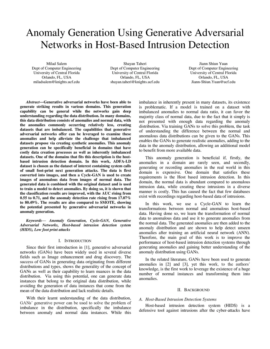Generative adversarial networks have been able to generate striking results in various domains. This generation capability can be general while the networks gain deep understanding regarding the data distribution. In many domains, this data distribution consists of anomalies and normal data, with the anomalies commonly occurring relatively less, creating datasets that are imbalanced. The capabilities that generative adversarial networks offer can be leveraged to examine these anomalies and help alleviate the challenge that imbalanced datasets propose via creating synthetic anomalies. This anomaly generation can be specifically beneficial in domains that have costly data creation processes as well as inherently imbalanced datasets. One of the domains that fits this description is the host-based intrusion detection domain. In this work, ADFA-LD dataset is chosen as the dataset of interest containing system calls of small foot-print next generation attacks. The data is first converted into images, and then a Cycle-GAN is used to create images of anomalous data from images of normal data. The generated data is combined with the original dataset and is used to train a model to detect anomalies. By doing so, it is shown that the classification results are improved, with the AUC rising from 0.55 to 0.71, and the anomaly detection rate rising from 17.07% to 80.49%. The results are also compared to SMOTE, showing the potential presented by generative adversarial networks in anomaly generation.