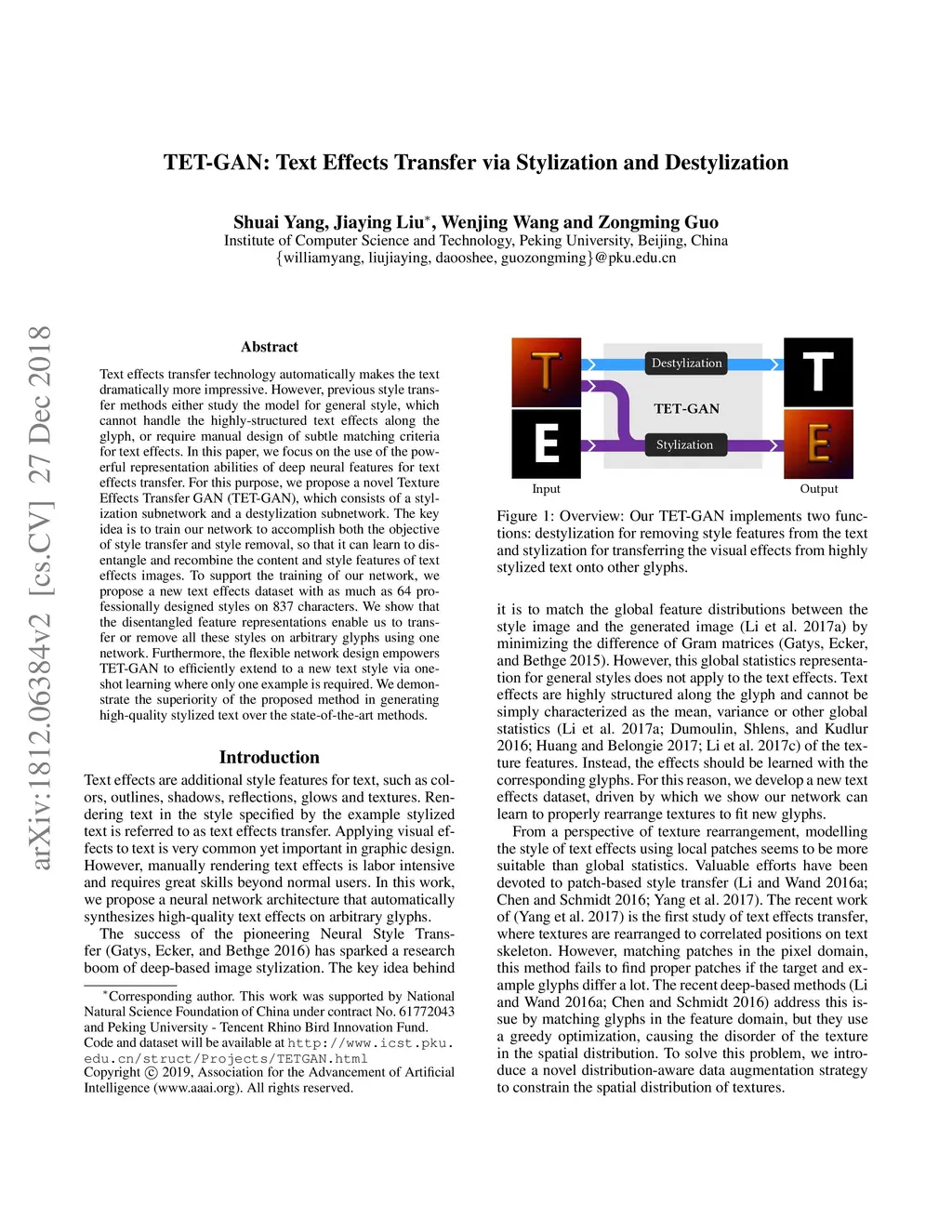 TET-GAN: Text Effects Transfer via Stylization and Destylization