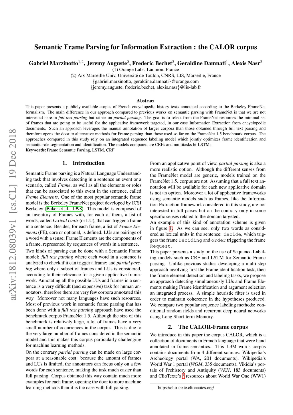 Semantic Frame Parsing for Information Extraction : the CALOR corpus