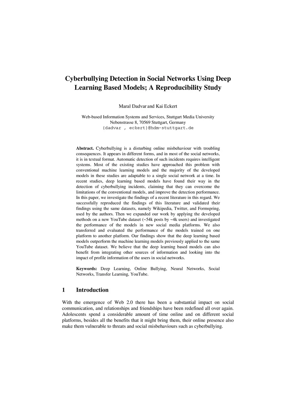 Cyberbullying is a disturbing online misbehaviour with troubling consequences. It appears in different forms, and in most of the social networks, it is in textual format. Automatic detection of such incidents requires intelligent systems. Most of the existing studies have approached this problem with conventional machine learning models and the majority of the developed models in these studies are adaptable to a single social network at a time. In recent studies, deep learning based models have found their way in the detection of cyberbullying incidents, claiming that they can overcome the limitations of the conventional models, and improve the detection performance. In this paper, we investigate the findings of a recent literature in this regard. We successfully reproduced the findings of this literature and validated their findings using the same datasets, namely Wikipedia, Twitter, and Formspring, used by the authors. Then we expanded our work by applying the developed methods on a new YouTube dataset (~54k posts by ~4k users) and investigated the performance of the models in new social media platforms. We also transferred and evaluated the performance of the models trained on one platform to another platform. Our findings show that the deep learning based models outperform the machine learning models previously applied to the same YouTube dataset. We believe that the deep learning based models can also benefit from integrating other sources of information and looking into the impact of profile information of the users in social networks.
