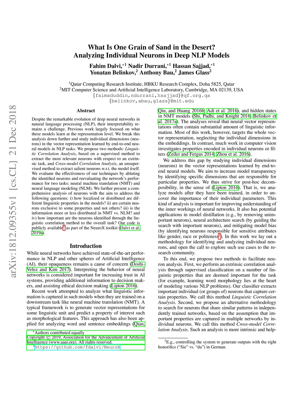 Despite the remarkable evolution of deep neural networks in natural language processing (NLP), their interpretability remains a challenge. Previous work largely focused on what these models learn at the representation level. We break this analysis down further and study individual dimensions (neurons) in the vector representation learned by end-to-end neural models in NLP tasks. We propose two methods: Linguistic Correlation Analysis, based on a supervised method to extract the most relevant neurons with respect to an extrinsic task, and Cross-model Correlation Analysis, an unsupervised method to extract salient neurons w.r.t. the model itself. We evaluate the effectiveness of our techniques by ablating the identified neurons and reevaluating the network's performance for two tasks: neural machine translation (NMT) and neural language modeling (NLM). We further present a comprehensive analysis of neurons with the aim to address the following questions: i) how localized or distributed are different linguistic properties in the models? ii) are certain neurons exclusive to some properties and not others? iii) is the information more or less distributed in NMT vs. NLM? and iv) how important are the neurons identified through the linguistic correlation method to the overall task? Our code is publicly available as part of the NeuroX toolkit (Dalvi et al. 2019).