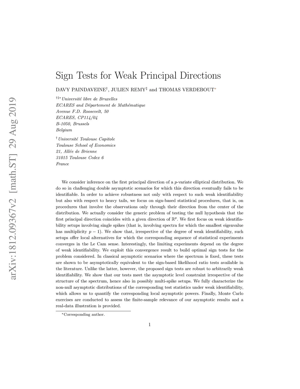 We consider inference on the first principal direction of a -variate elliptical distribution. We do so in challenging double asymptotic scenarios for which this direction eventually fails to be identifiable. In order to achieve robustness not only with respect to such weak identifiability but also with respect to heavy tails, we focus on sign-based statistical procedures, that is, on procedures that involve the observations only through their direction from the center of the distribution. We actually consider the generic problem of testing the null hypothesis that the first principal direction coincides with a given direction of . We first focus on weak identifiability setups involving single spikes (that is, involving spectra for which the smallest eigenvalue has multiplicity ). We show that, irrespective of the degree of weak identifiability, such setups offer local alternatives for which the corresponding sequence of statistical experiments converges in the Le Cam sense. Interestingly, the limiting experiments depend on the degree of weak identifiability. We exploit this convergence result to build optimal sign tests for the problem considered. In classical asymptotic scenarios where the spectrum is fixed, these tests are shown to be asymptotically equivalent to the sign-based likelihood ratio tests available in the literature. Unlike the latter, however, the proposed sign tests are robust to arbitrarily weak identifiability. We show that our tests meet the asymptotic level constraint irrespective of the structure of the spectrum, hence also in possibly multi-spike setups. We fully characterize the non-null asymptotic distributions of the corresponding test statistics under weak identifiability, which allows us to quantify the corresponding local asymptotic powers.